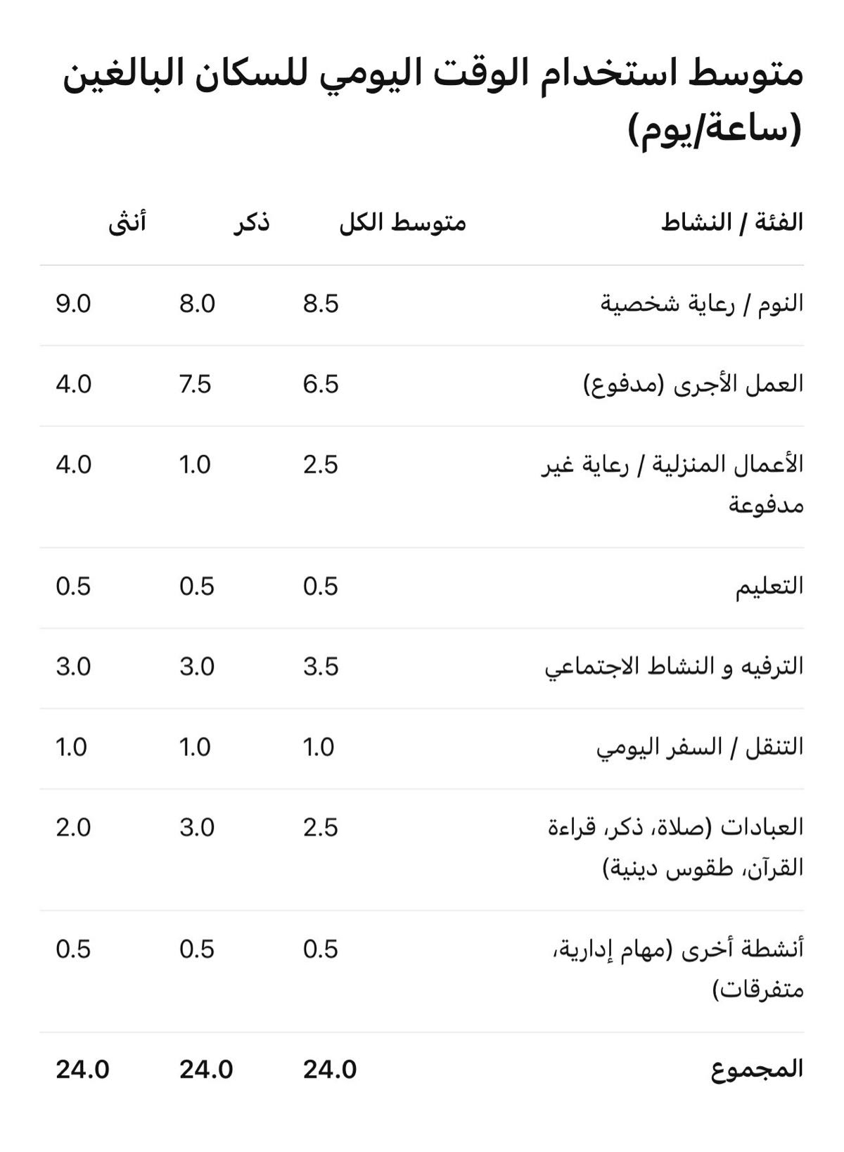 الوقت هو أحد أهم الموارد غير المتجددة في حياة الإنسان. ويُعد فهم كيفية توزيع الأنشطة اليومية للسكان أداة أساسية لتصميم السياسات الاجتماعية، الاقتصادية، والصحية.