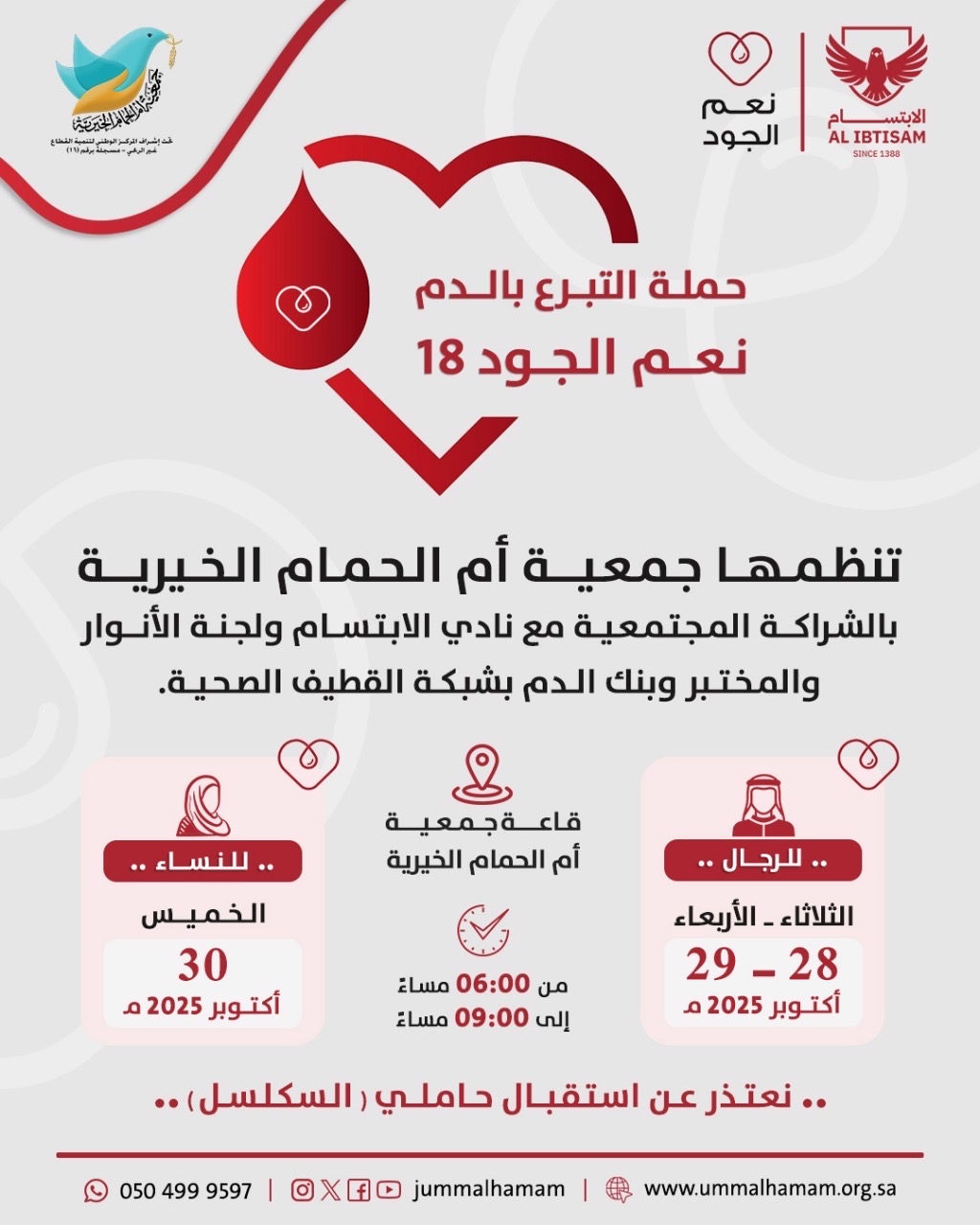 ودعت جمعية أم الحمام كافة أفراد المجتمع القادرين صحياً إلى المبادرة بالمشاركة في هذا العمل الإنساني النبيل، الذي يسهم بشكل مباشر في دعم بنوك الدم وتلبية احتياجات المرضى والمصابين.
