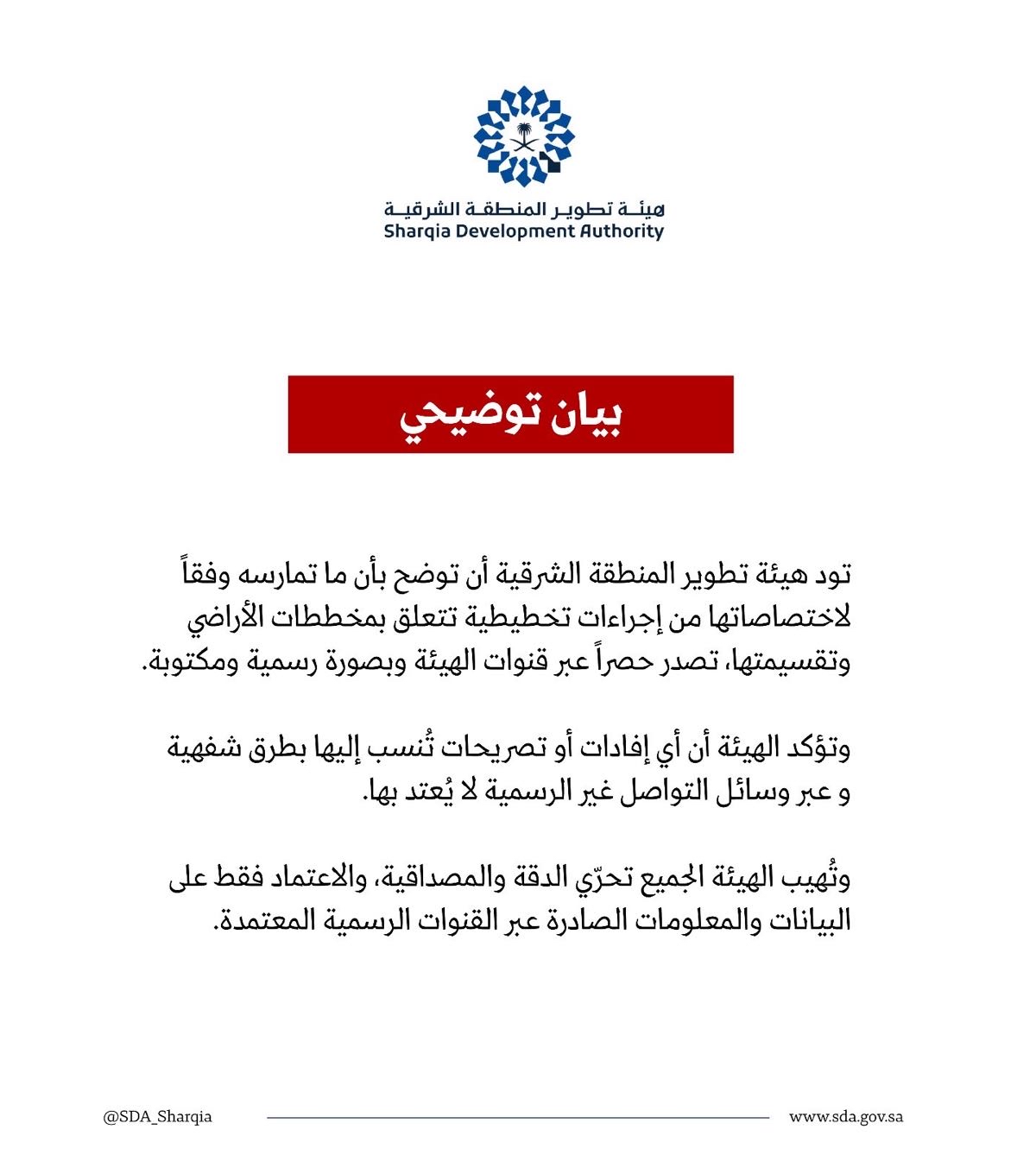 أصدرت هيئة تطوير المنطقة الشرقية بيانًا توضيحيًا أكدت فيه أن جميع الإجراءات التخطيطية المتعلقة بالأراضي وتقسيماتها، والتي تندرج ضمن اختصاصاتها، تُصدر حصريًا عبر قنوات الهيئة الرسمية المكتوبة والمرئية.