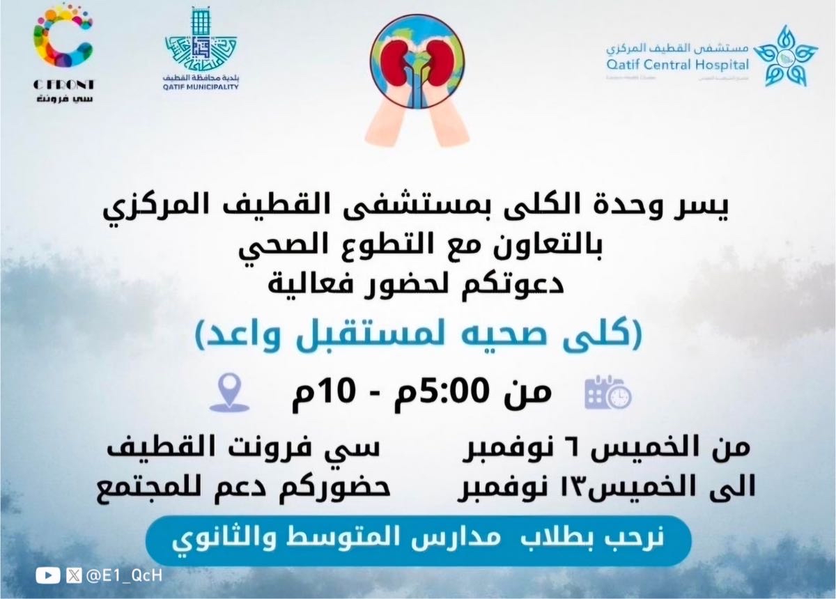 أعلنت وحدة الكلى في مستشفى القطيف المركزي عن تنظيم فعالية صحية توعوية موسعة، تحت شعار ”كلية صحية لمستقبل واعد“، والتي تقام بالتعاون مع مبادرات التطوع الصحي.