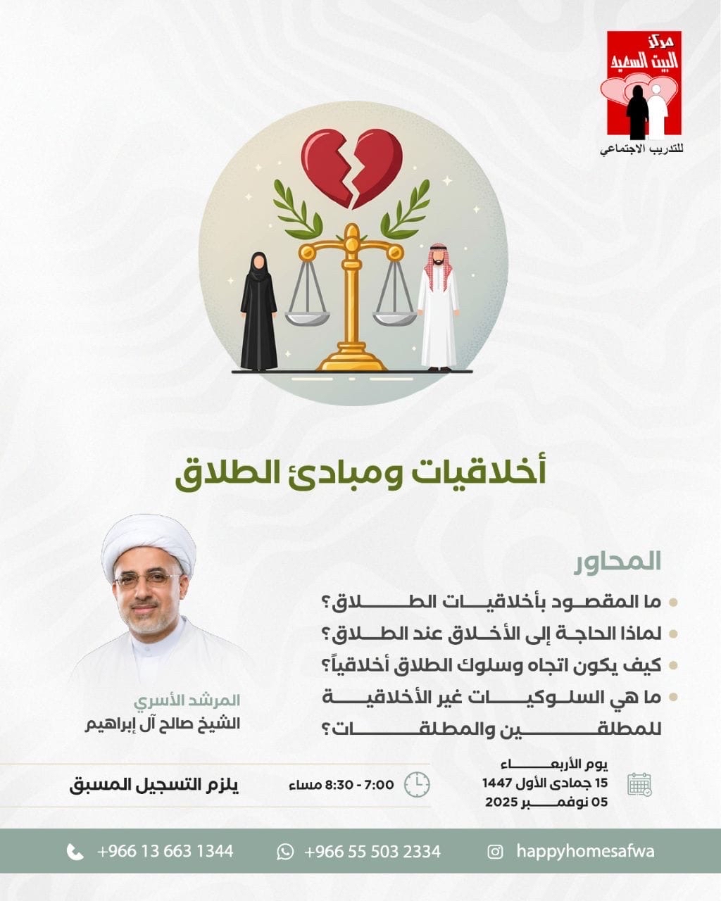 ينظم مركز البيت السعيد للتدريب الاجتماعي، مساء الأربعاء، ندوة إرشادية متخصصة تحت عنوان ”أخلاقيات ومبادئ الطلاق“، يقدمها المرشد الأسري الشيخ صالح آل إبراهيم.