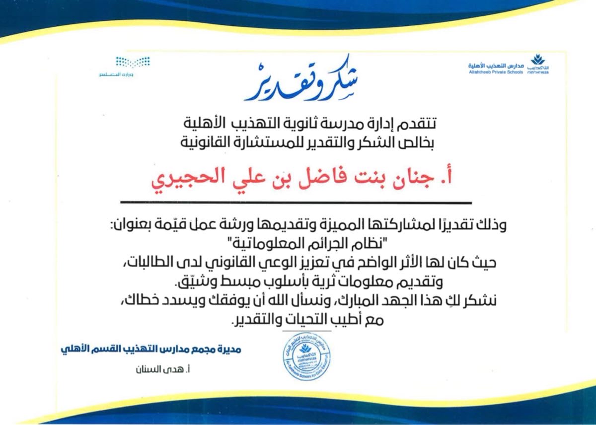 وفي الختام، قدمت مديرة المدارس، هدى السنان، شهادة شكر وتقدير للمحامية جنان آل حجيري تقديراً لهذه المبادرة التوعوية.