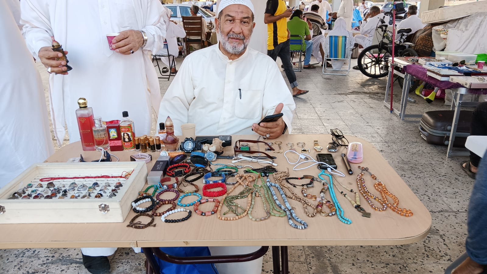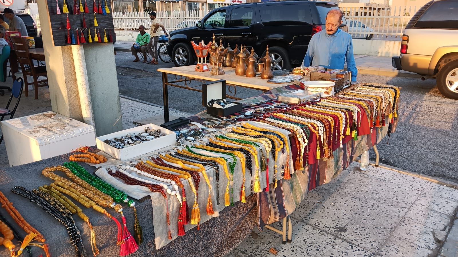 بسطة تضم مجموعة من المسابيح في سوق واقف بداخل سوق الخميس «تصوير: كاتب المقال».