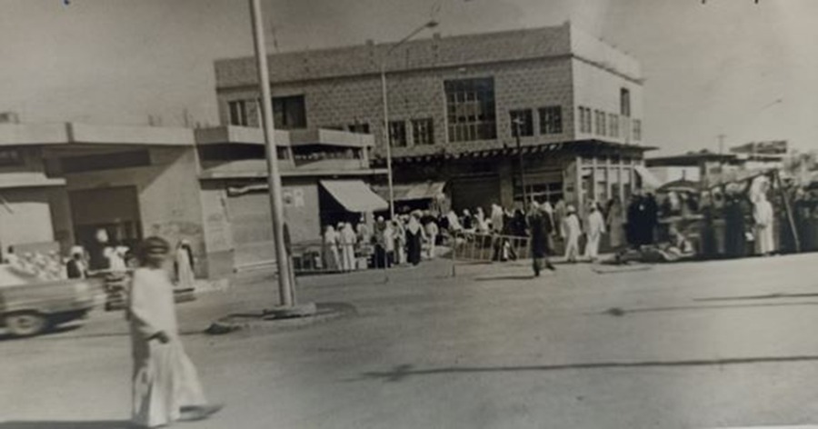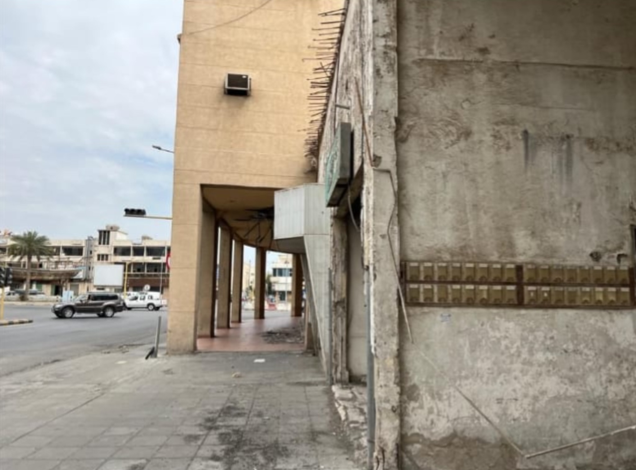 في امام الصورة يظهر المبنى الواقع عند تقاطع شارع الملك عبد العزيز مع شارع الإمام الصادق