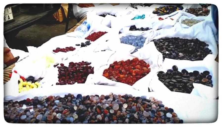 بسطة لبيع الأحجار شبه الكريمة المفردة، بكميات كبيرة على مفرش أرضي في سوق الأحجار الكريمة في مدينة القطيف. «تصوير: حسين عبيدان».