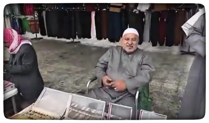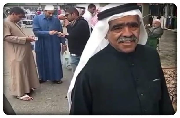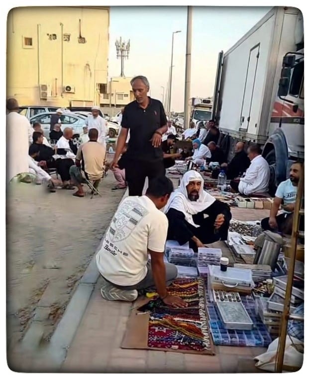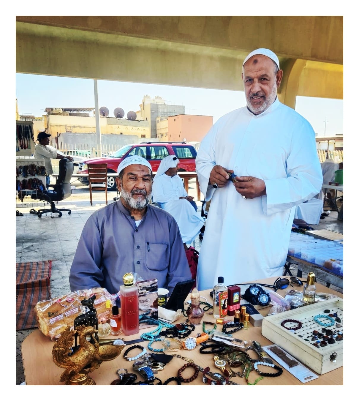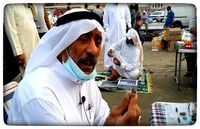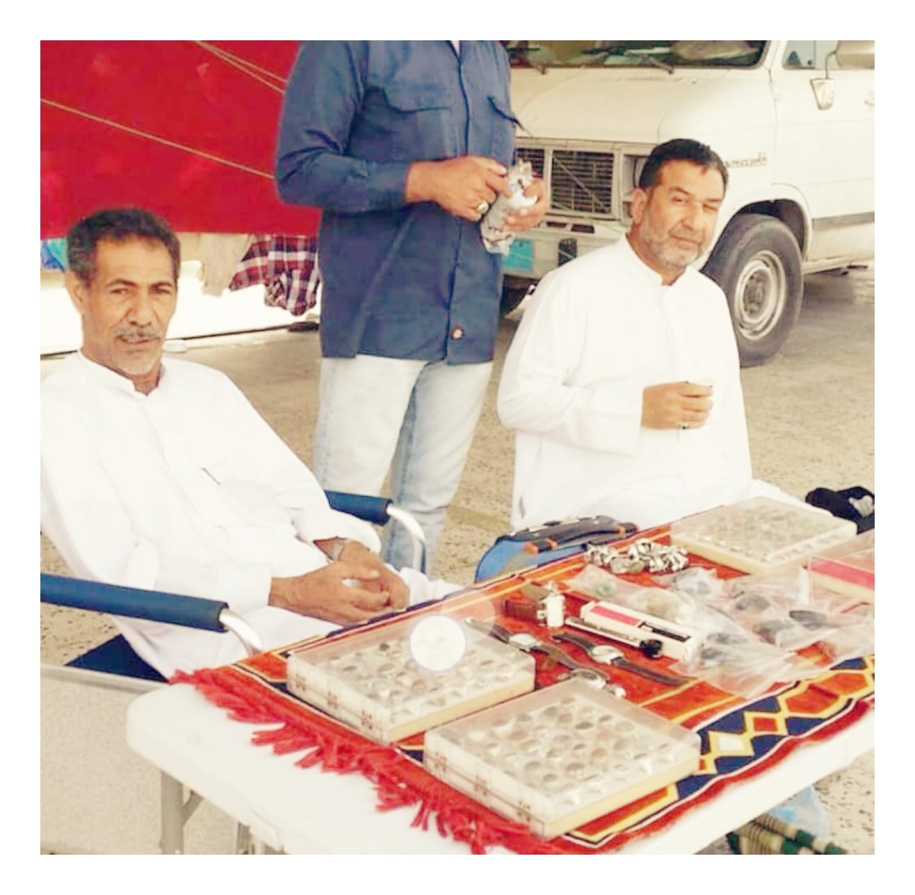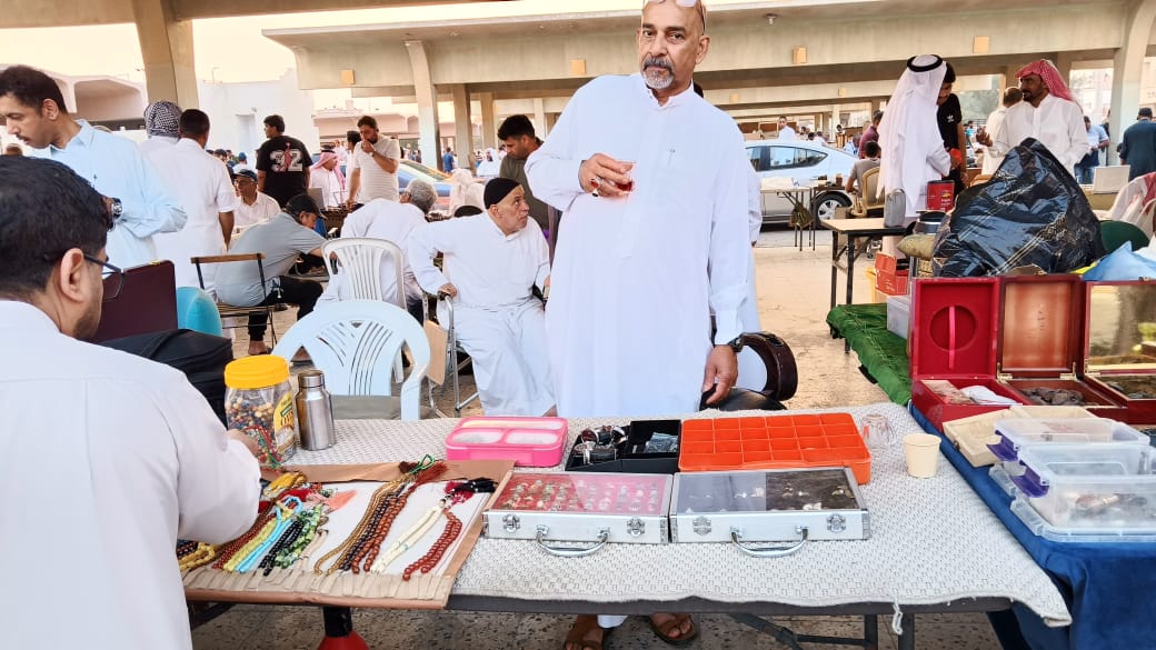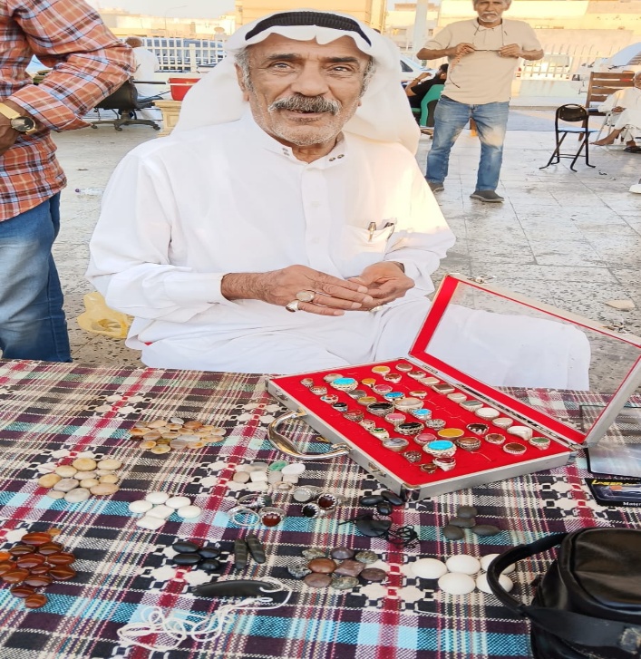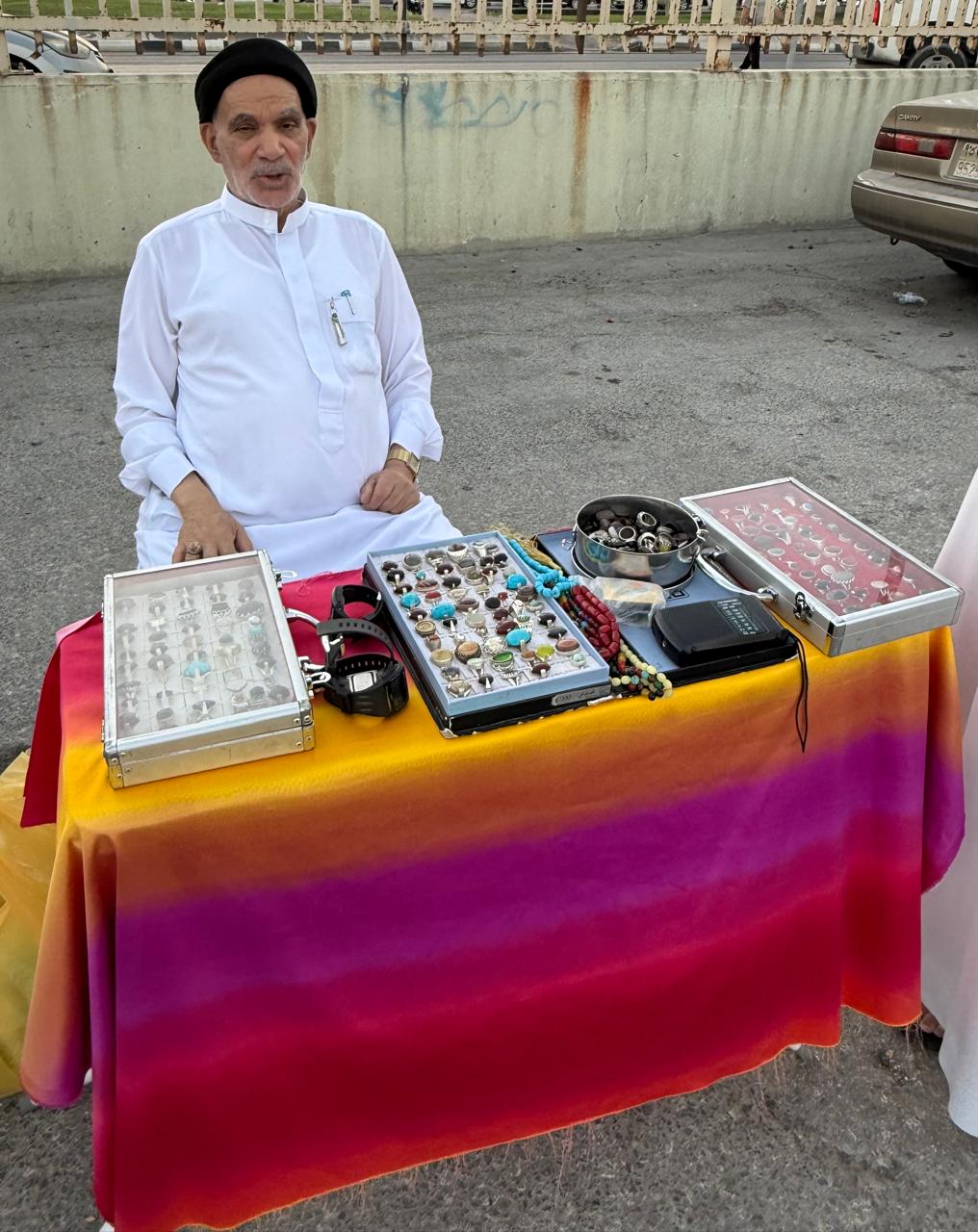 الأخ الحاج علي بن جعفر القديحي ”أبو حسين“ من أهالي الدبابية أحد أقدم الباعة المتجولين في مختلف مواقع سوق بيع الأحجار الكريمة في القطيف، حيث أمضى فيها أكثر من 44 عامًا، مما جعله من الوجوه المعروفة والمخضرمة في سوق الأحجار الكريمة. «تصوير: كاتب المقال».