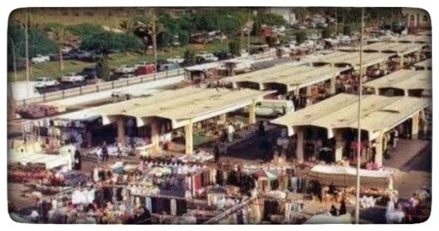 سوق الخميس القديم في حي السطر بشارع الملك فيصل، قبل إزالة المظلات التي كانت تُستخدم كأماكن للباعة «مصدر الصورة: مجلة القافلة تصوير عبد الله يوسف دبيس العدد شهرشعبان 1407 ه/مارس/ابريل 1987 م» والمجلة من أرشيف الأستاذ منصور محروس الصلبوخ - حفظه الله تعالى -.