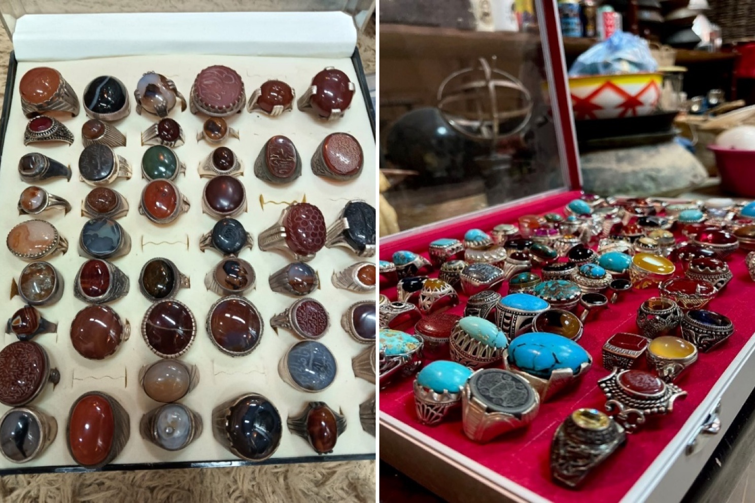 مجموعة من الخواتيم الفضية المركب عليها أحجار العقيق والفيروز «تصوير: كاتب المقال».