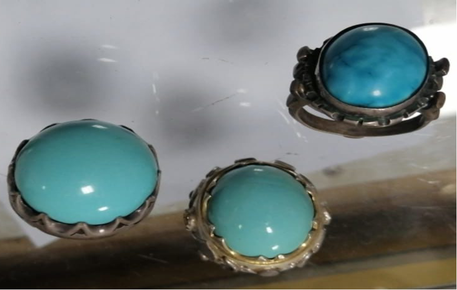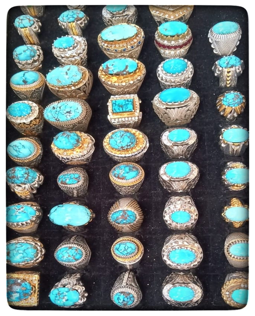 مجموعة من الخواتيم الفضية، مرصعة بأحجار الفيروز النيسابوري المعروف بلونه الأزرق الصافي، والفيروز الشجري الذي يتميز بعروقه المتداخلة، إضافة إلى الفيروز المعرق الذي يتميز بلونه الأزرق مع شكل خطوط سوداء متعرجة تخترق وجه الحجر بصورة غير منتظمة، وتُعد هذه الأنواع من الأحجار المفضلة لدى أهالي المنطقة «تصوير: كاتب المقال».