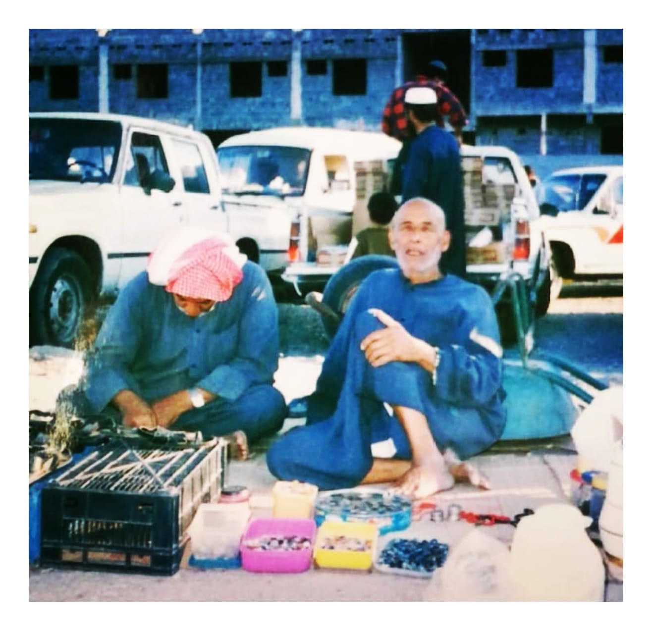 «من اليمين» بسطة المرحوم الحاج منصور حسن الأمرد من أهالي الخويلدية في مفرش على الأرض بسوق واقف في أحد أركان سوق الخميس «من اليسار» أحد المتسوقين «مصدر الصورة: مكي خليفة الشاخور»