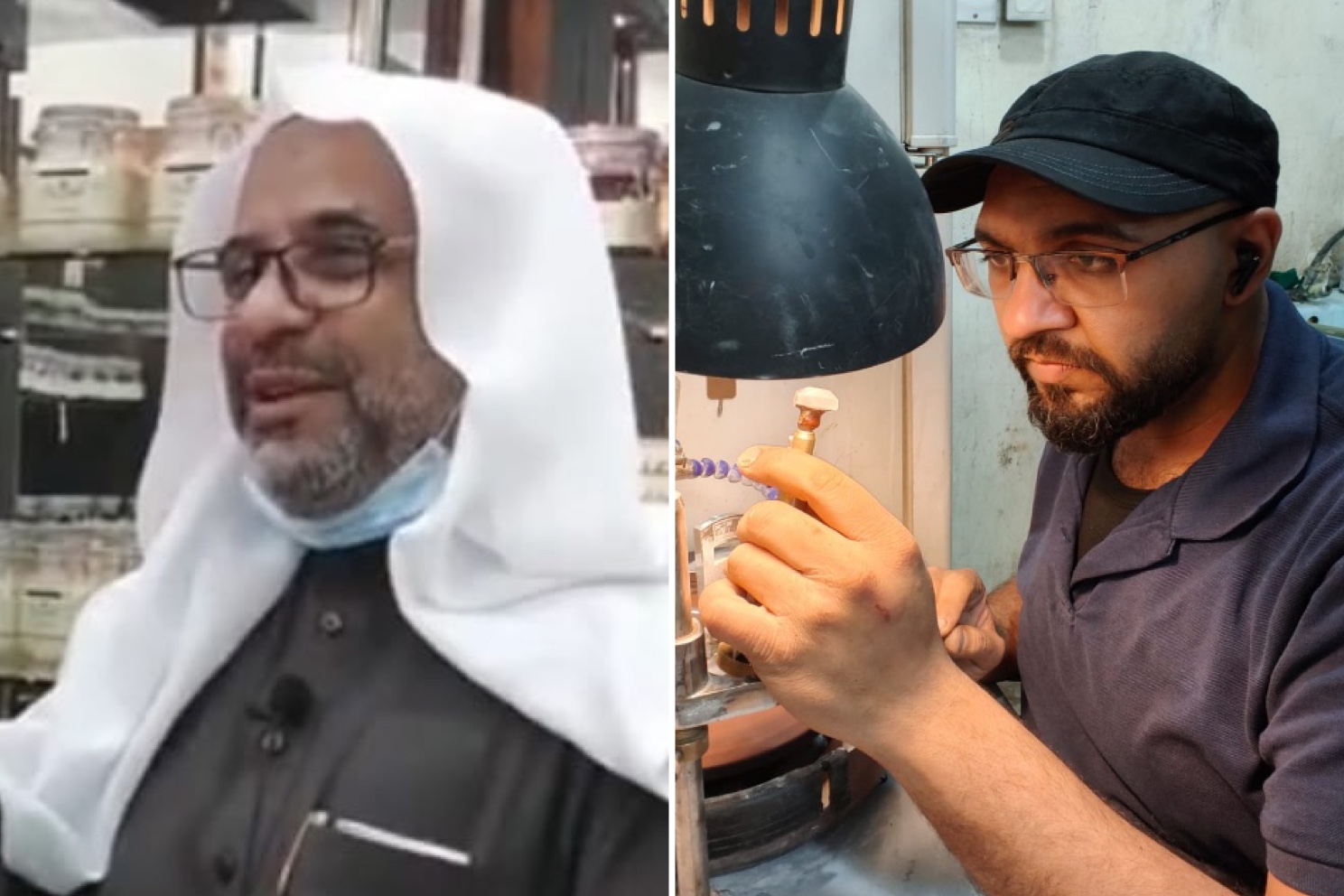 «يمين» الفني حسن المسباح في ورشته «يسار» الحاج سلمان السنان