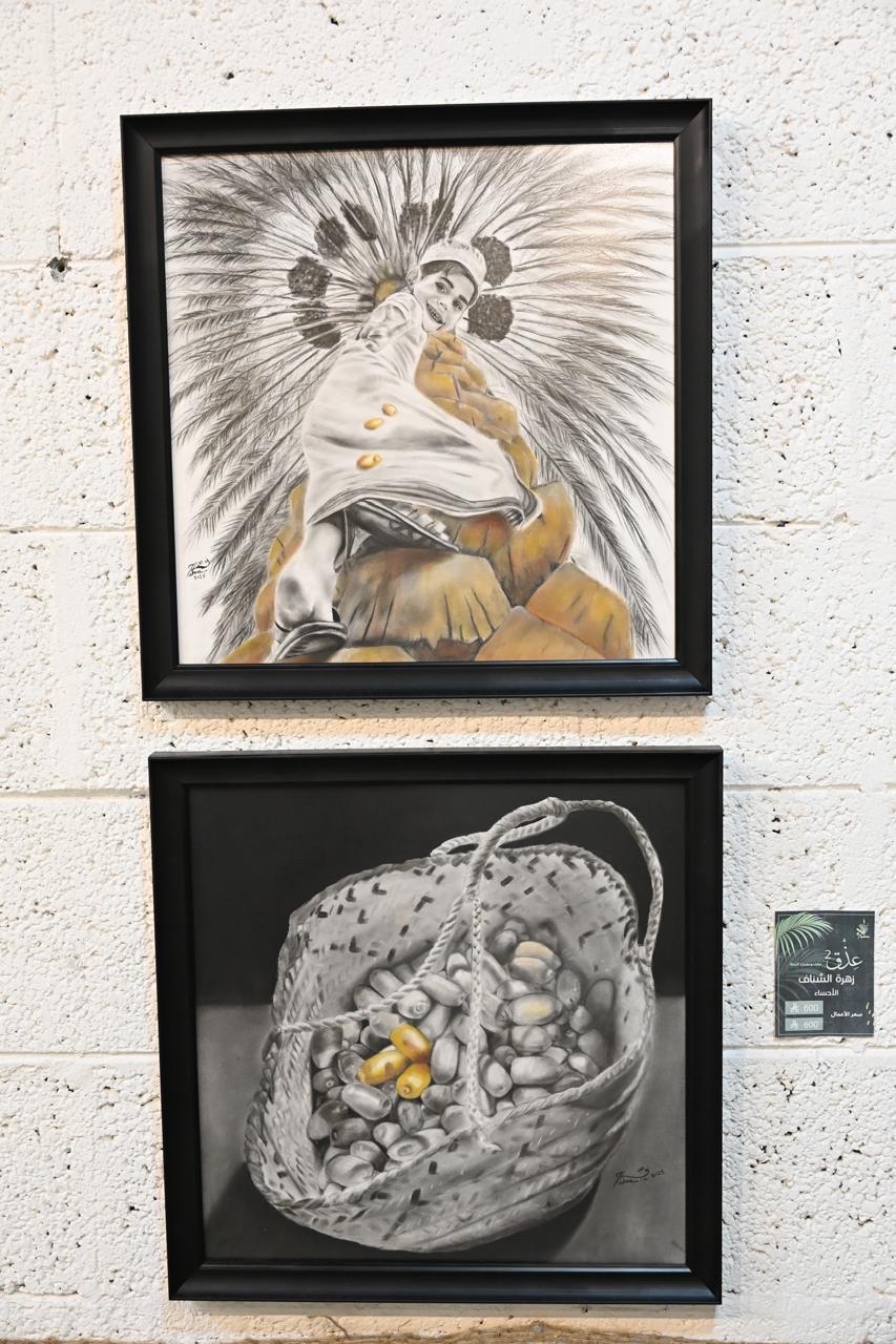 وتضمنت مشاركة الشناف لوحتين بقياس 40×40 سم، صورت الأولى مشهداً حياً مفعماً بالحركة لطفل يتسلق جذع النخلة بمهارة لجني الثمار، في حين جسدت اللوحة الثانية سلة ممتلئة بالرطب، معتمدة على التكرار اللوني بين العملين لترسيخ الفكرة في ذهن المتلقي.