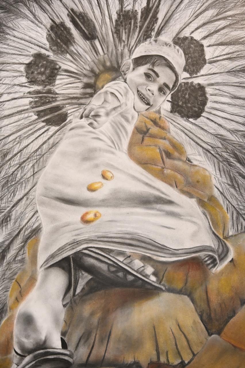 وعمدت الشناف في هذه المشاركة إلى كسر نمطها الفني المعتاد القائم على الرسم بالفحم الأسود، متخذة قراراً فنياً جريئاً بالانتقال إلى الألوان الصريحة، لتتناغم فرشاتها بدقة مع شعار المعرض ”تراث وحضارة النخلة“ وتبرز الهوية البصرية للأحساء.