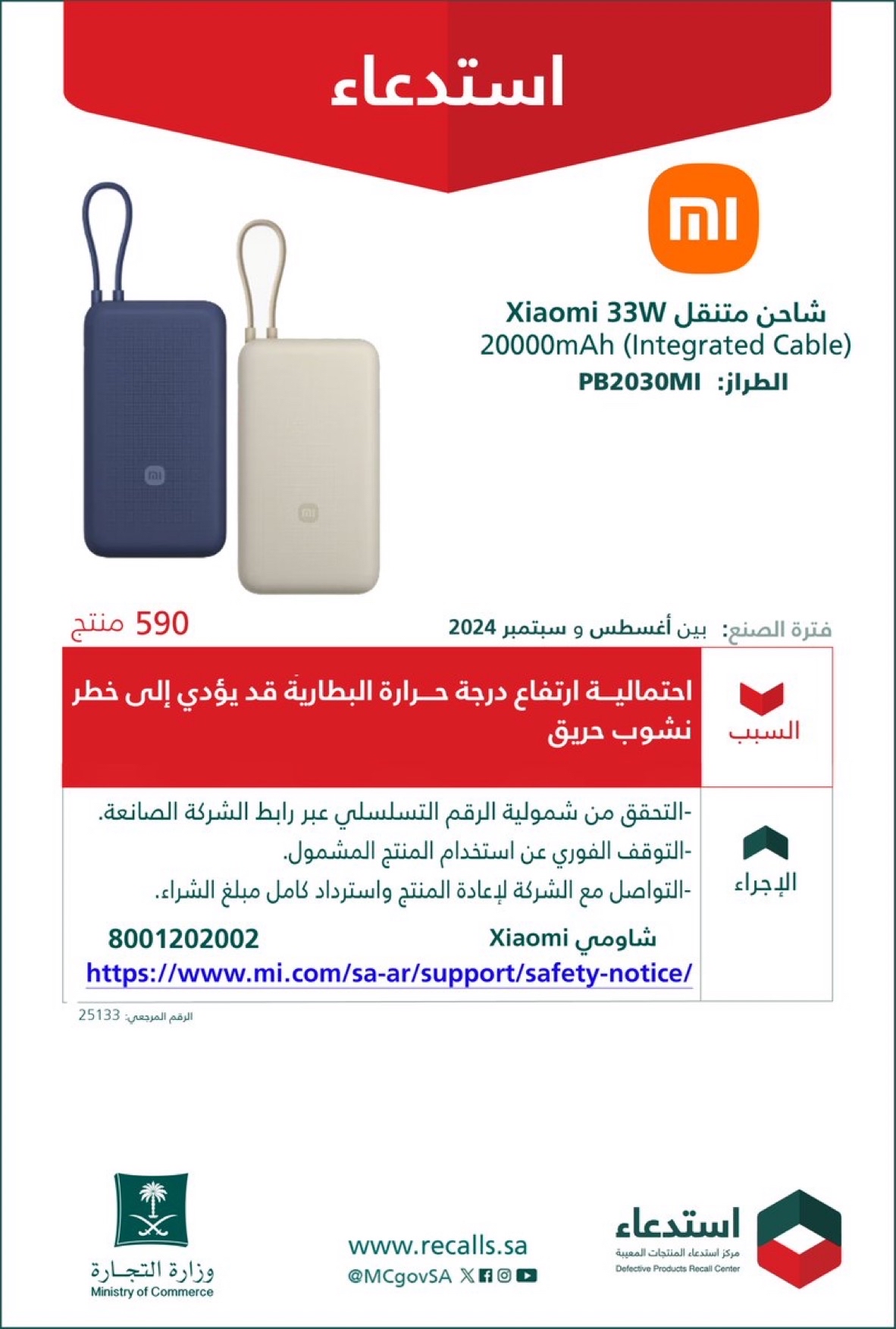 حذرت وزارة التجارة المستهلكين بإعلانها استدعاء 590 شاحناً متنقلاً من علامة ”شاومي“ ”Xiaomi“.