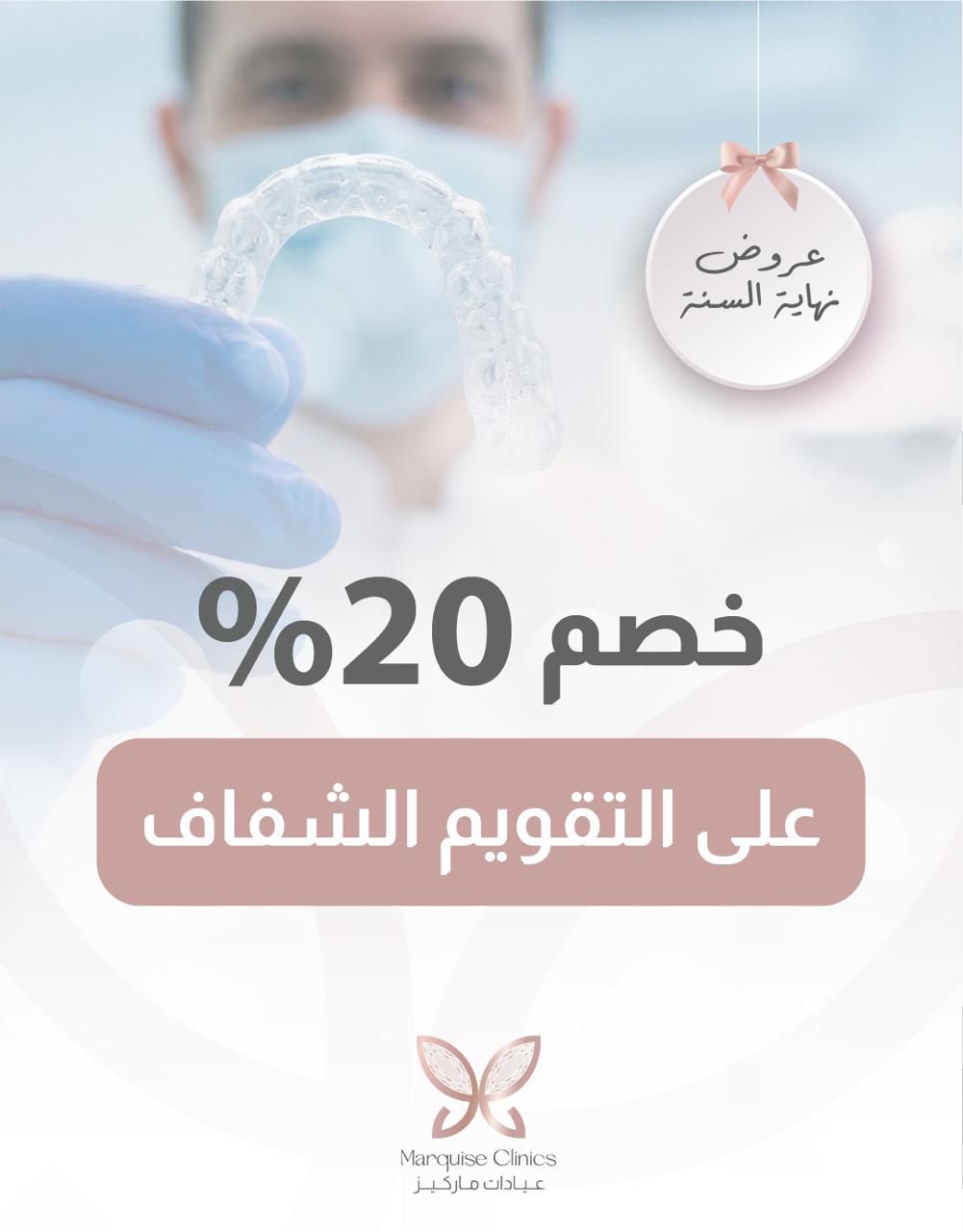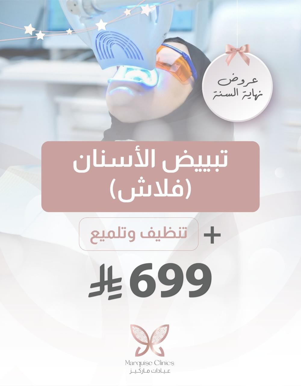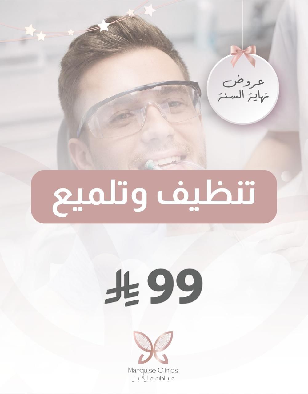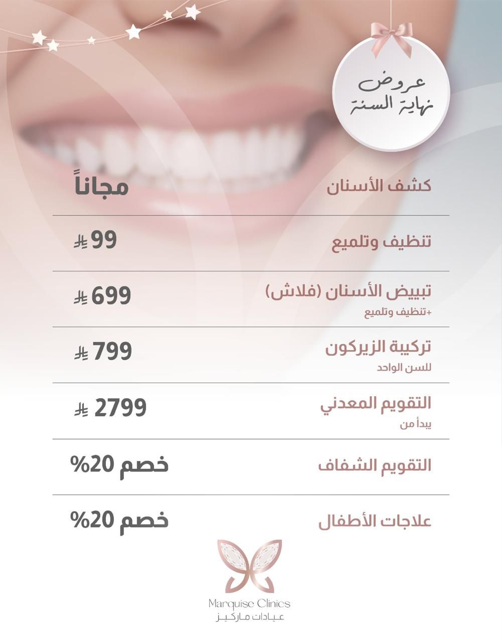مع نهاية السنة، جهّزنا لكم عروض مميّزة في عيادات ماركيز كشف مجاني، تنظيف وتلميع، وتبييض سريري بسعر خاص، إضافة لخصومات على التقويم وعلاجات الأطفال.