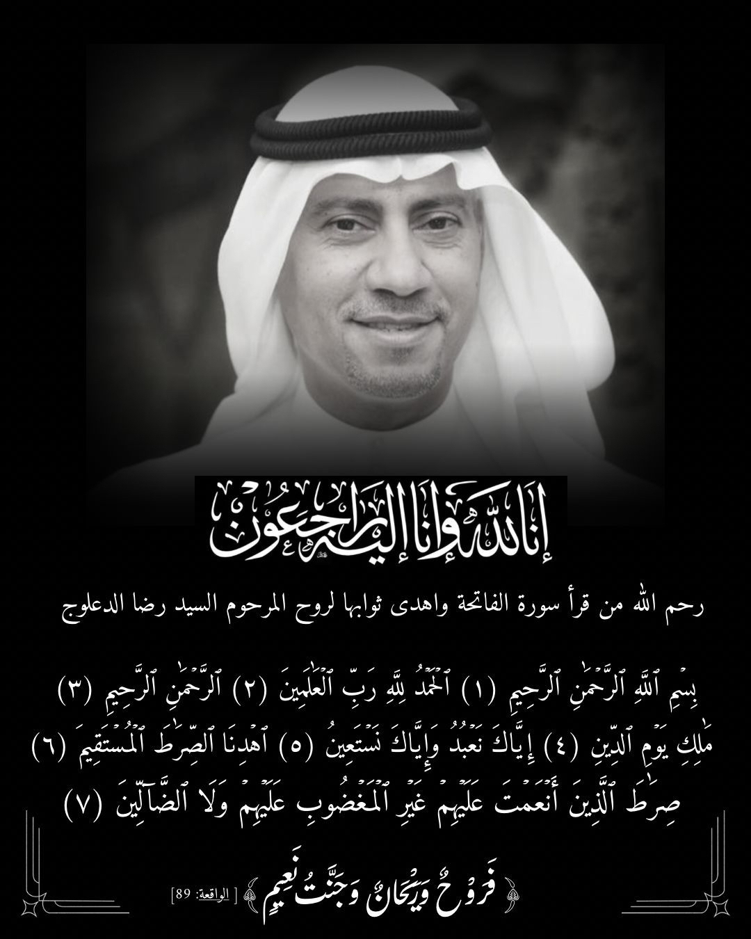 إيمانًا بقضاء الله وقدره، فقد أهالينا ببلدة الربيعية أحد رجالاتها، رجل مجتمع من المشهود لهم بالتقوى والصلاح والأخلاق العالية، هو الحاج المؤمن الطيب الودود المرحوم السيد رضا بن السيد حسن السيد هاشم الدعلوج أبو السيد عدنان.