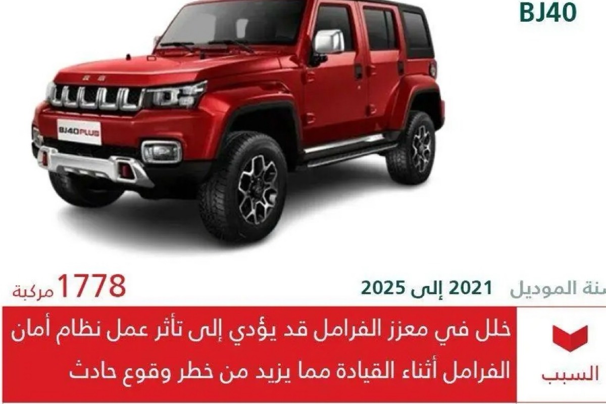 استدعت وزارة التجارة 1778 مركبة من طراز ”BAIC BJ40“ موديلات 2021 إلى 2025، عازية ذلك إلى خلل فني مؤثر في ”معزز الفرامل“ قد يرفع مخاطر وقوع الحوادث، وملزمةً شركة ”بترومين للسيارات“ بإجراء الإصلاحات المجانية فوراً لجميع المتضررين.