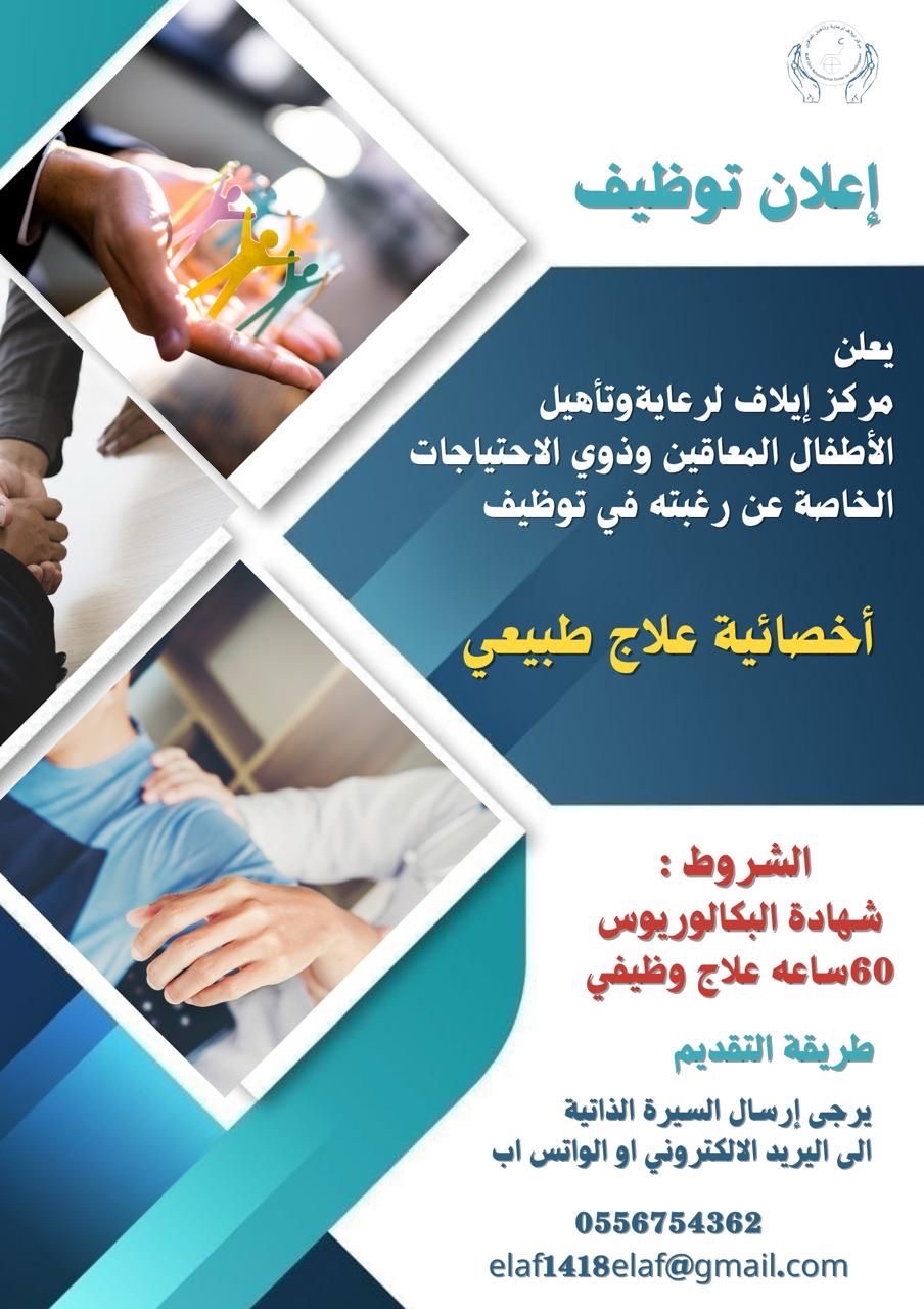 يُعلن مركز إيلاف لرعاية وتأهيل الأطفال المعاقين وذوي الاحتياجات الخاصة عن توفر فرصة وظيفية متخصصة، للعمل ضمن فريقه، في التخصص التالي: