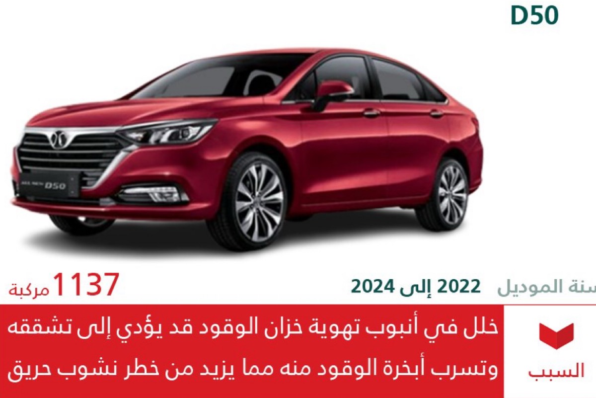 وأوضحت الوزارة أن سبب الاستدعاء يكمن في وجود خلل فني في أنبوب تهوية خزان الوقود، حيث تبينت احتمالية تعرضه للتشقق، مما يؤدي إلى تسرب أبخرة الوقود وارتفاع مؤشرات خطر الاشتعال ونشوب حريق لا قدر الله.