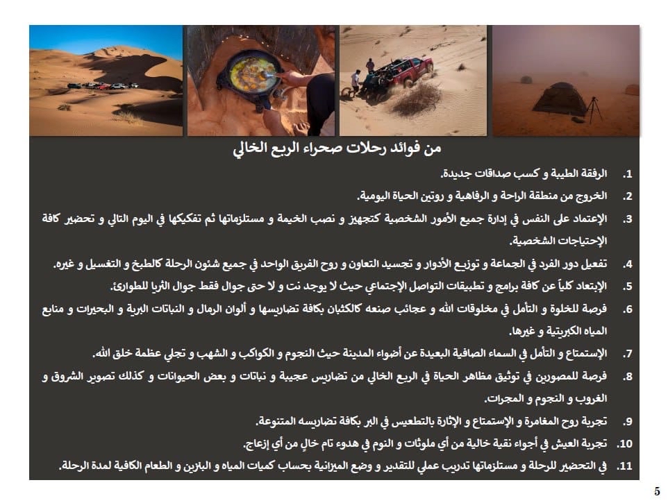 ويسعى الكتيب إلى استنطاق صمت الرمال وتوثيق ملامح الحياة في واحدة من أكثر مناطق العالم غموضاً واتساعاً، كاشفاً عن تفاصيل لا تلتقطها العين العابرة.