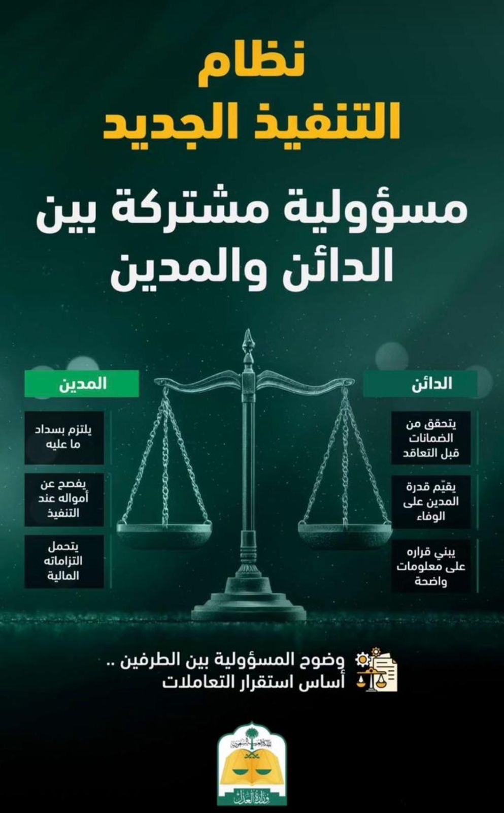 أرست وزارة العدل قواعد مرحلة جديدة من الاستقرار المالي، عبر إقرار مبدأ ”المسؤولية المشتركة“ ضمن نظام التنفيذ الجديد، لضبط العلاقة التعاقدية بين الدائن والمدين وحفظ حقوق كافة الأطراف بوضوح وشفافية تامة.