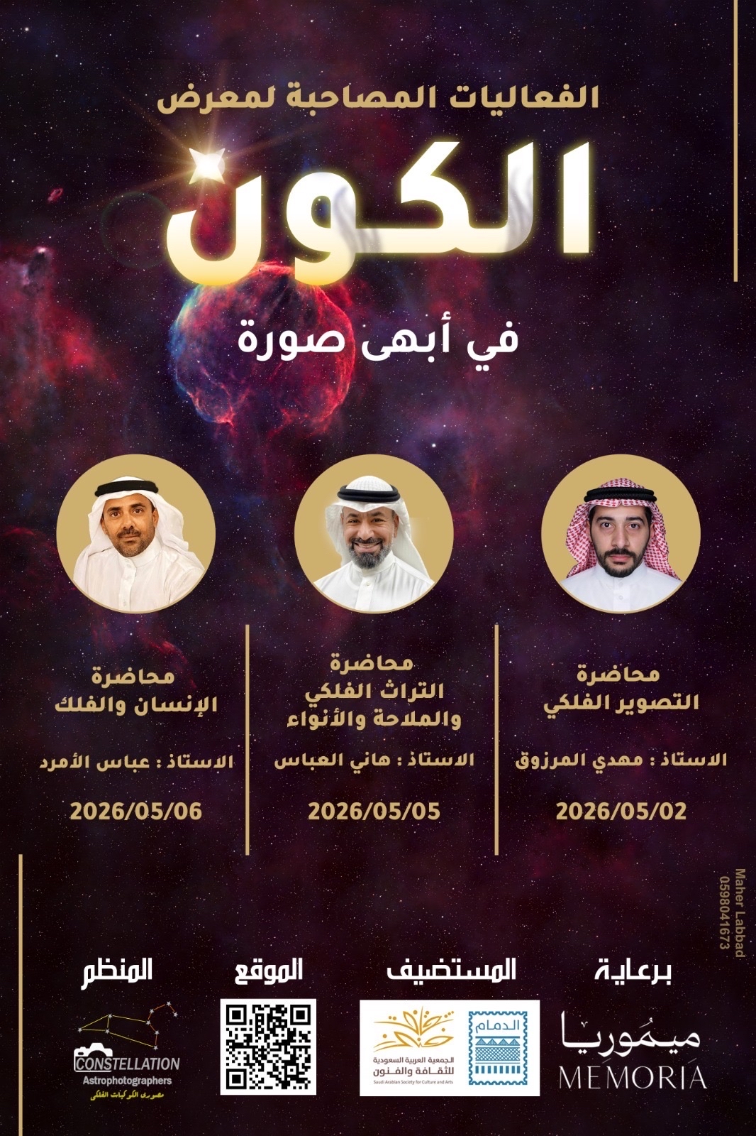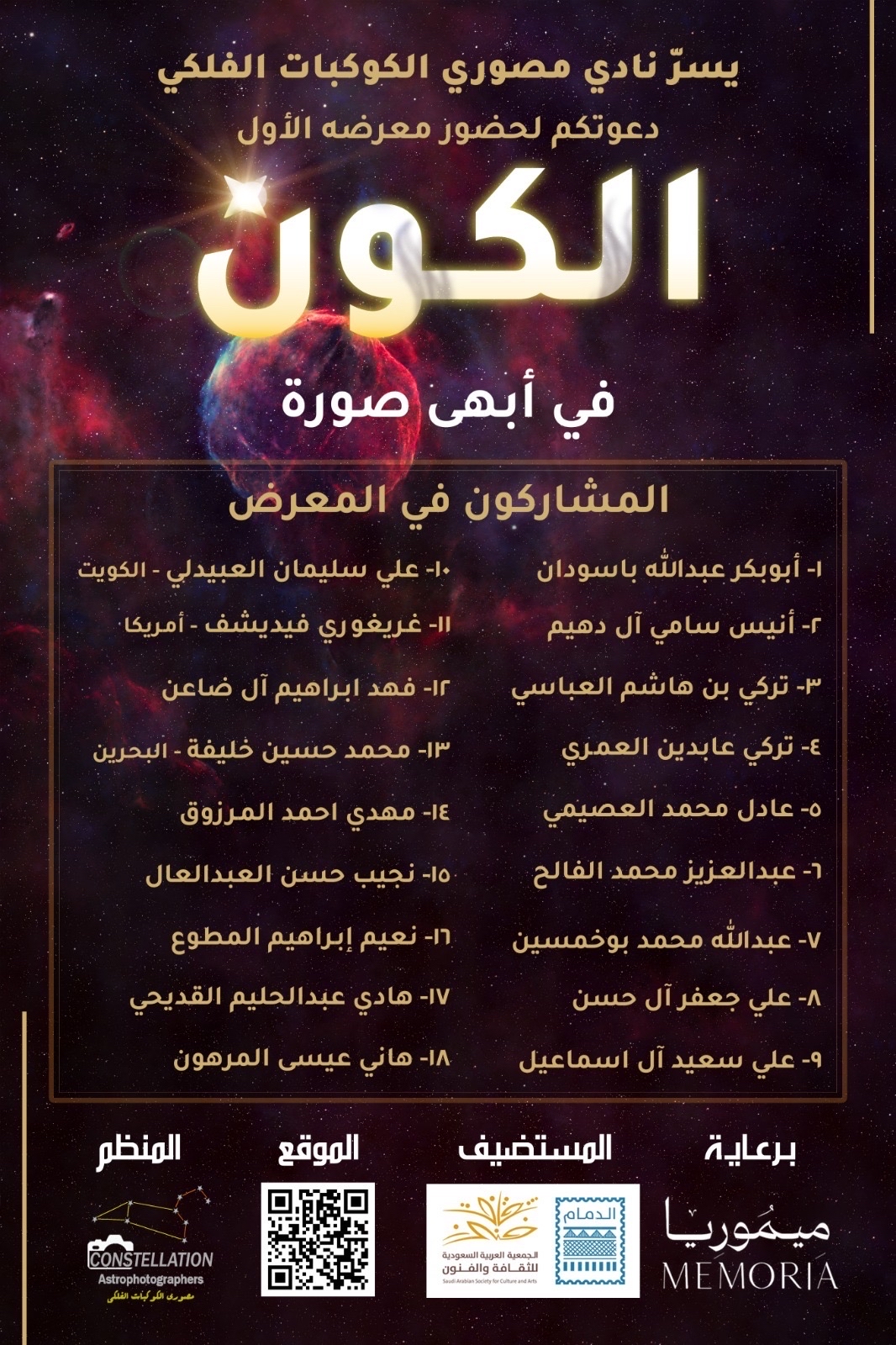 يطلق نادي مصوري الكوكبات الفلكي، مطلع مايو المقبل، معرضه الفني الأول ”الكون في أبهى صورة“ بمقر الجمعية العربية السعودية للثقافة والفنون بالدمام، بمشاركة 18 مصوراً محلياً ودولياً لاستكشاف جماليات الفضاء.