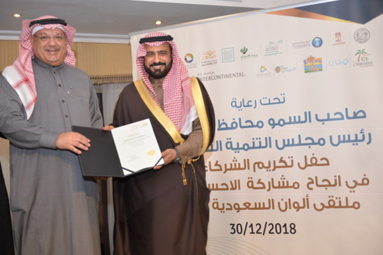 كُرِم شركاء النجاح في ملتقى ألوان السعودية 2018 تحت مظلة مجلس التنمية السياحة بالأحساء ، وذلك بقاعة الاندلس بأحد الفنادق وذلك برعاية محافظ الأحساء الأمير بدر بن جلوي ، وبحضور وكيل المحافظة معاذ الجعفري يوم الأربعاء.