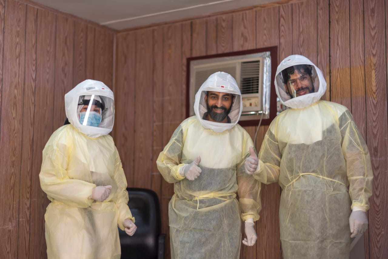 وثق المصور الفوتغرافي حسين آل سلطان وزميلته إتزان أبو الليرات جهود الكوادر الطبية في الخط الامامي بنقطة الفحص عن كورونا بمركز صحي دارين.