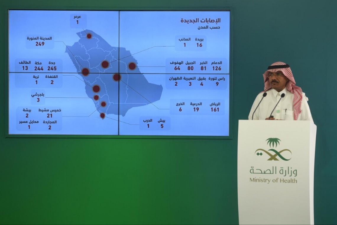 وتوزعت حالات الإصابة الجديدة بين مدن المملكة كالتالي: المدينة المنورة ”249“، جدة ”245“، مكة المكرمة ”244“، الرياض ”161“، الدمام ”126“، الخبر ”81“، الجبيل ”80“، الهفوف ”64“، خميس مشيط ”21“، الدرعية ”19“، بريدة ”16“، الطائف ”13“، رأس تنورة ”9“، الخرج ”6“، بيش ”5“، بقيق ”4“، النعيرية ”3“، بلجرشي ”3“، بيشة ”2“، الظهران ”2“، المجاردة ”2“، القنفذة ”2“، عرعر ”1“، الدرب ”1“، محايل عسير ”1“، تربه ”1“، المذنب ”1“.