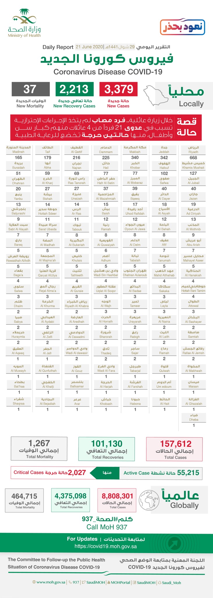 أعلنت وزارة الصحة، اليوم الاحد، تسجيل 3379 إصابة جديدة بفيروس ”كورونا“ المستجد ”كوفيد - 19“ في المملكة. منها 216 في القطيف و40 بصفوى.