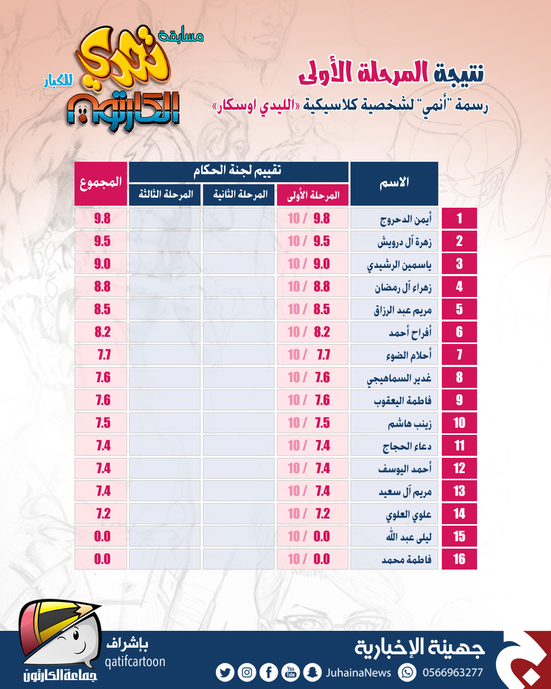 تأهل 16 متسابقا في ”تحدي الكارتون للكبار“ والتي أطلقتها صحيفة جهينة الإخبارية بإشراف جماعة الكارتون