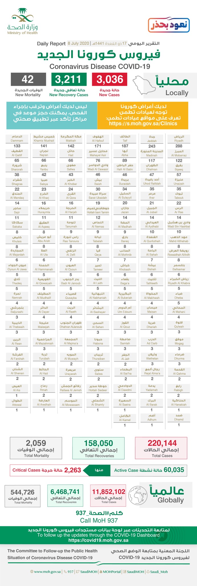 وتم تسجيل 3211 حالات تعافٍ جديدة منها 329 في القطيف و66 بصفوى، لترتفع الحالات الإجمالية للتعافي إلى 158050 حالة (نحو 71% من إجمالي الإصابات المسجلة).