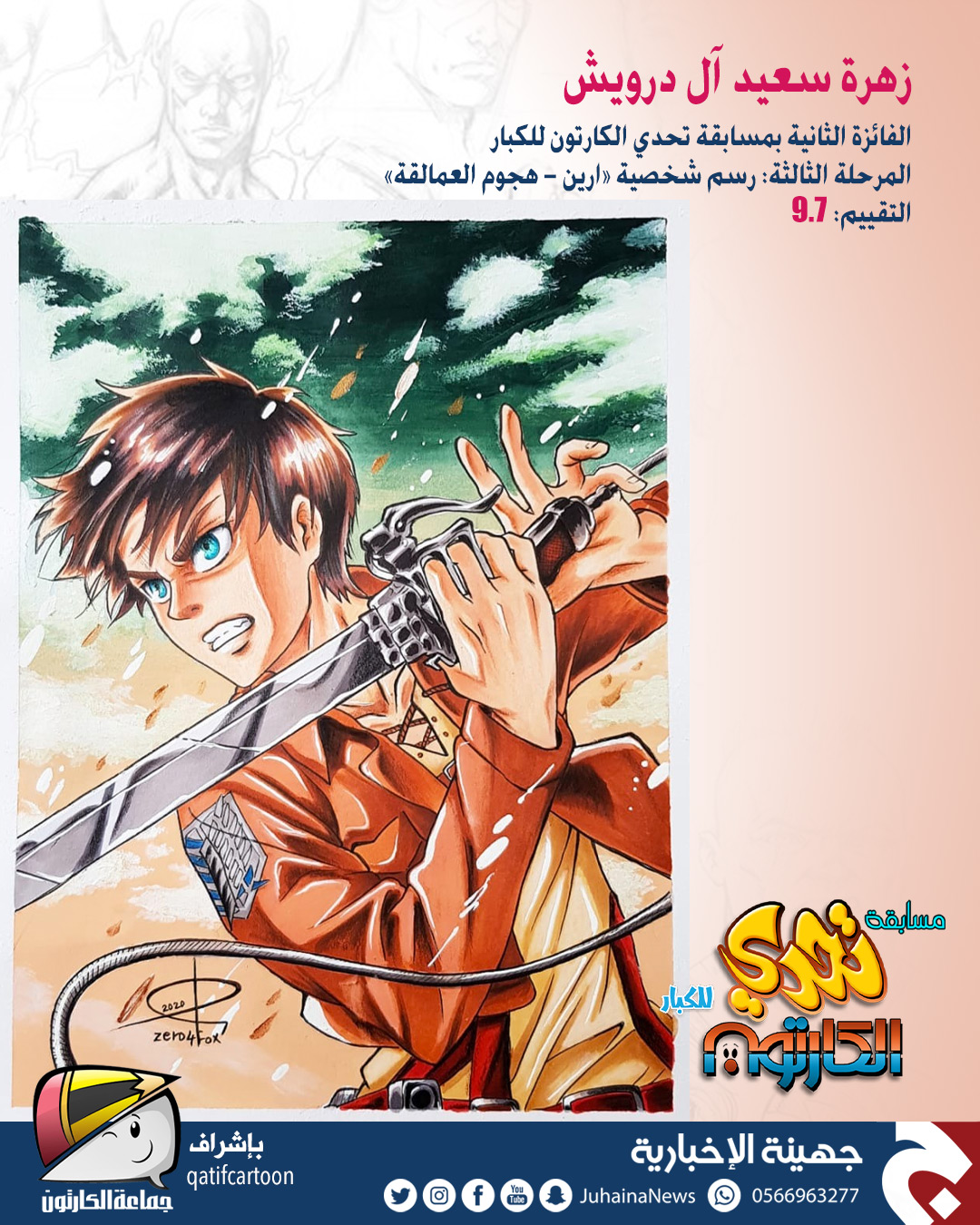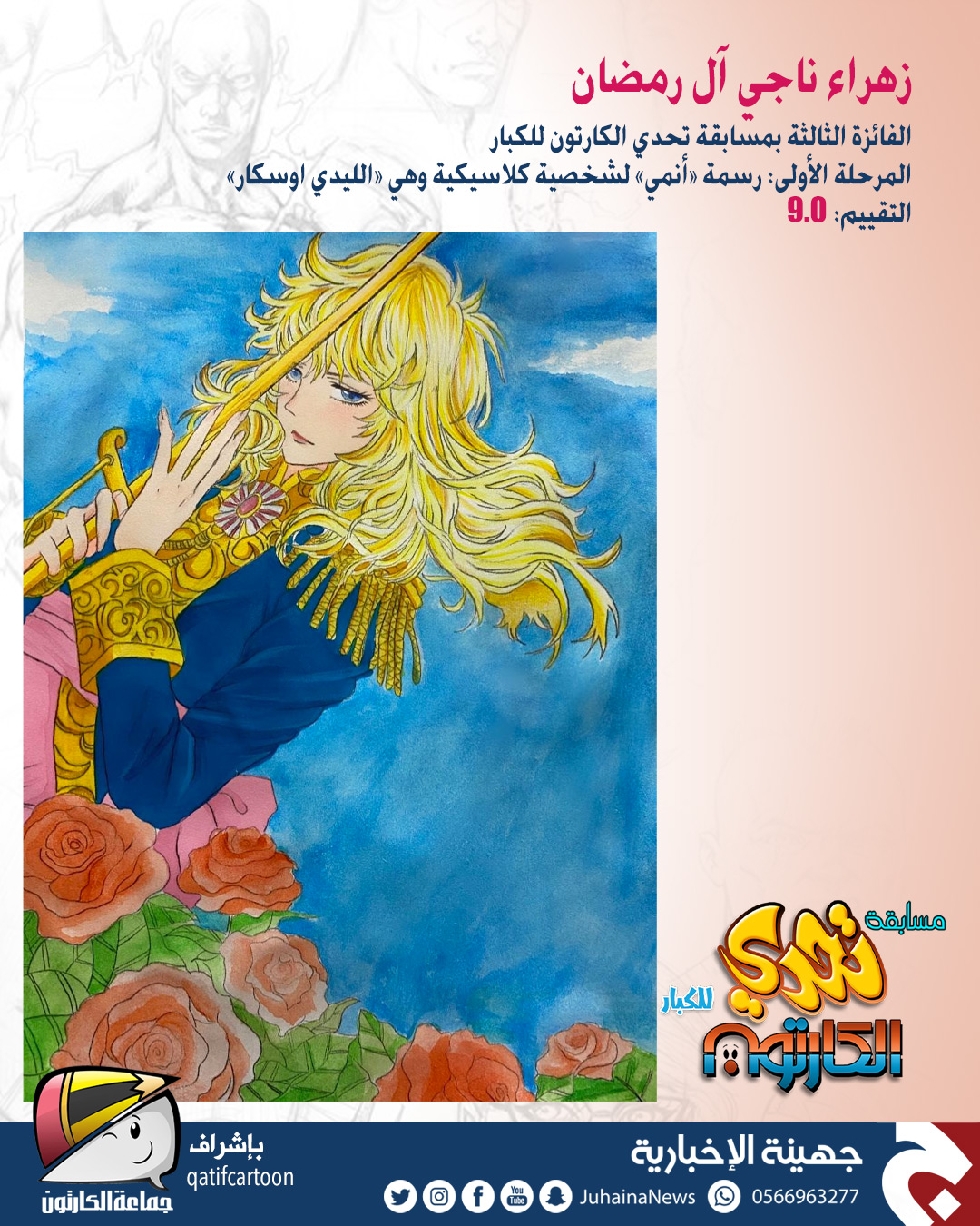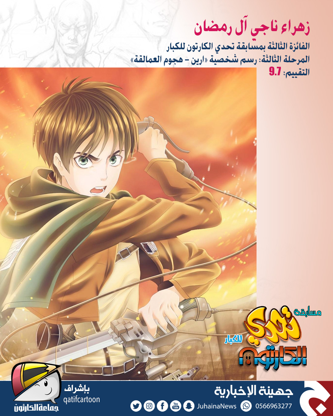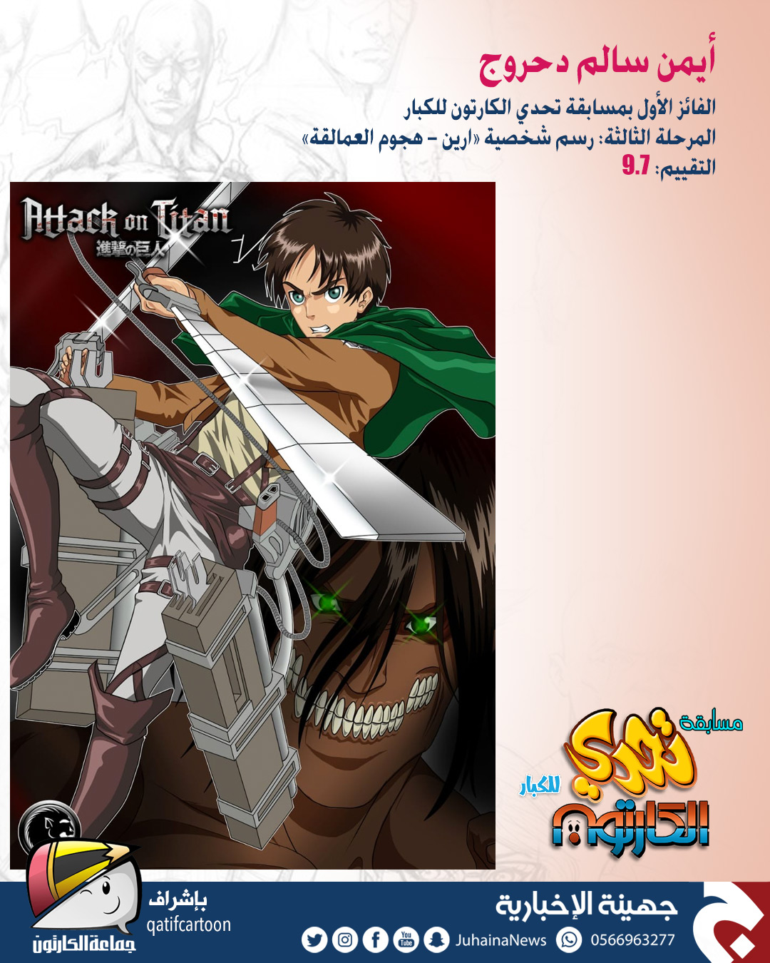 حقّق المتسابق أيمن الدحروج المركز الأول في مسابقة ”تحدي الكارتون“ للكبار التي نظمتها صحيفة جهينة الإخبارية بإشراف جماعة الكارتون.