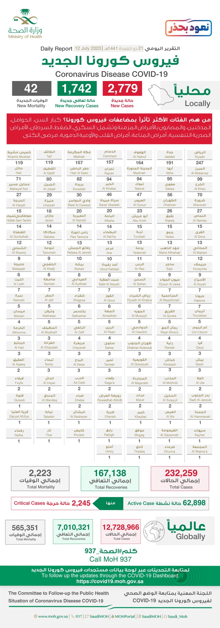 وبلغ إجمالي الحالات النشطة 62898 حالات، منها 2245 حالة حرجة.