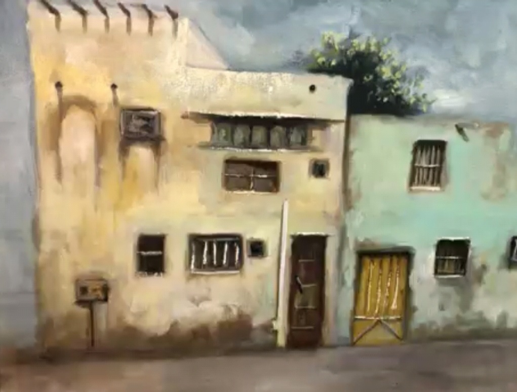 ومن صورة طبيعية مُلتقطة لمنظر طبيعي طبقت الماجد فنون الرسم التاثيري بالألوان الزيتية معتمدة على إسقاط الضوء والظل في اللوحة فنقلت المتلقي عبر فرشاتها لمشاهد المنازل القديمة.