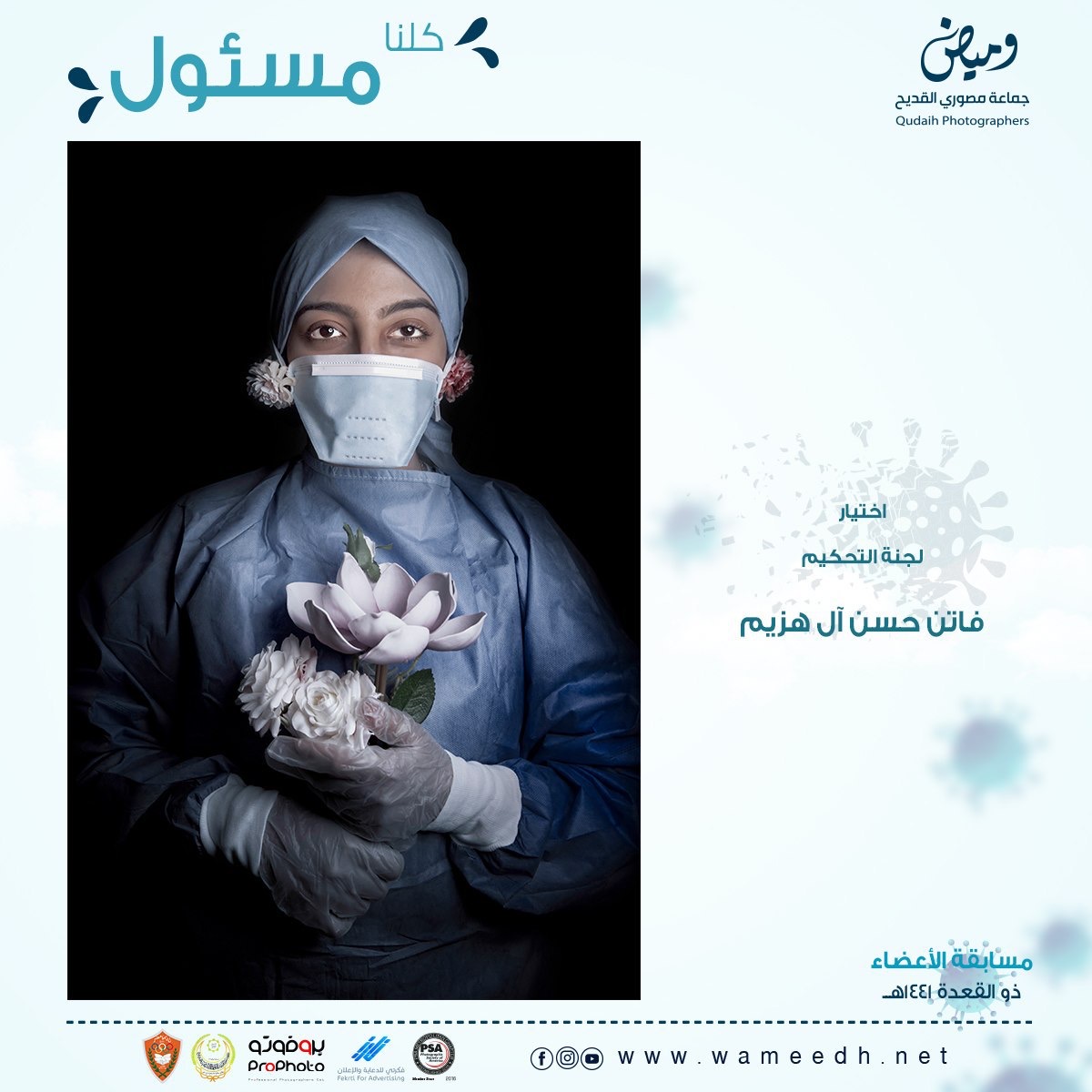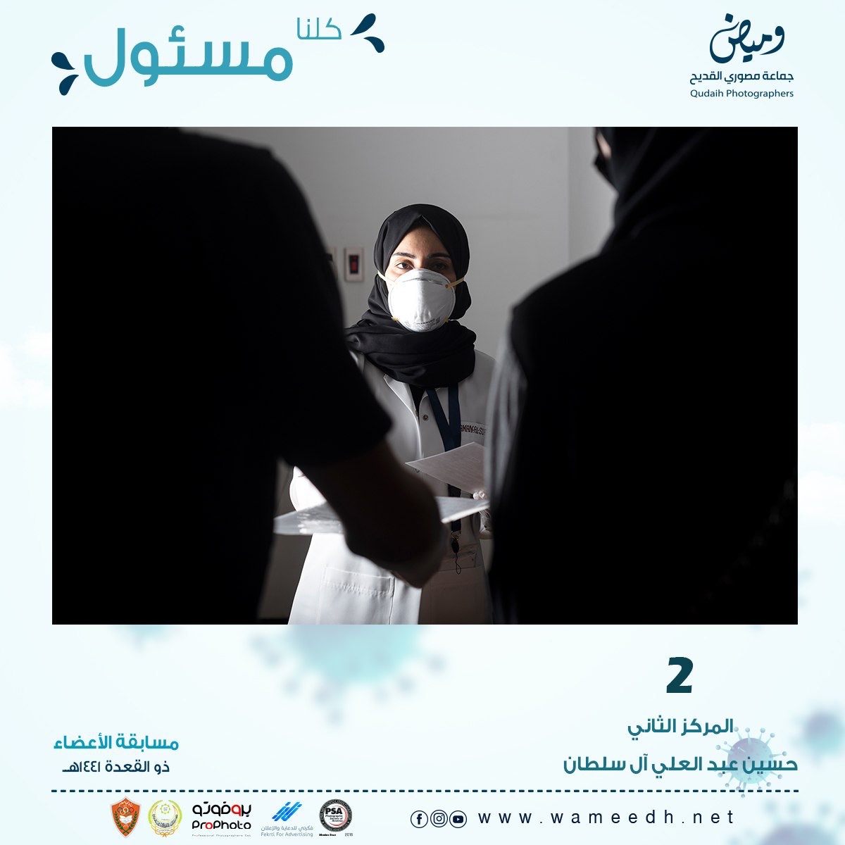 وذكر الفوتوغرافي حسين آل سلطان صاحب الصورة الفائزة بالمركز الثاني لـ ”جهينة الإخبارية“ أن عنوان الصورة هو ”كورونا بين ألم وأمل“ وتجسد معاناة أبطال الصحة في مواجهة فايروس كورونا ولبس الكمام وتعقيم اليدين.
