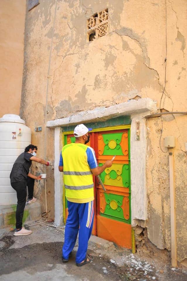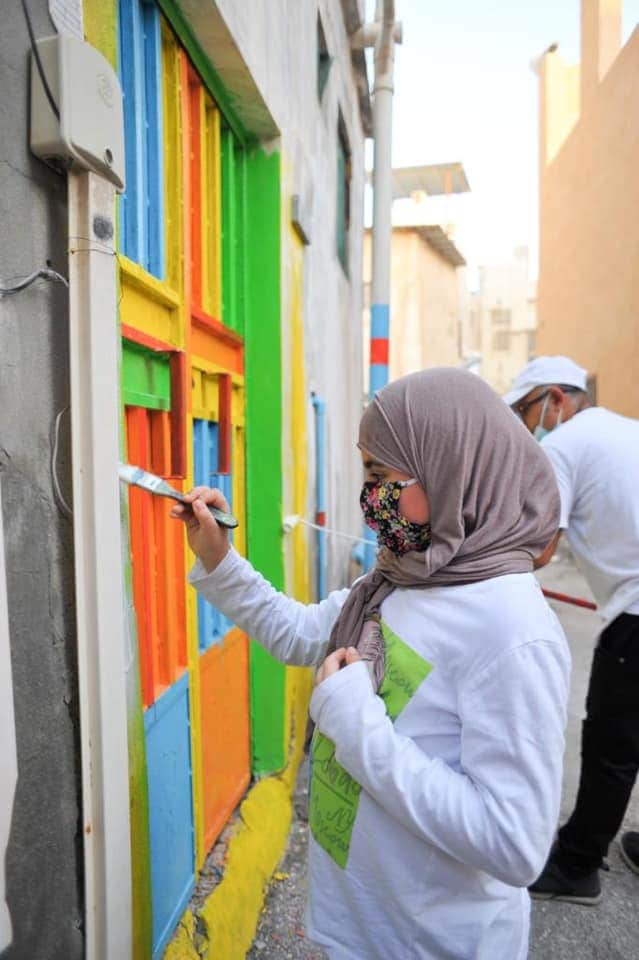 وشارك في المبادرة الأهلية التي أطلقها التشكيلي عبد العظيم الضامن مع فريق المحبة والسلام التطوعي، عشرون متطوع من الرجال والنساء والأطفال بالرسم والتلوين على الأبواب والطرقات الداخلية.