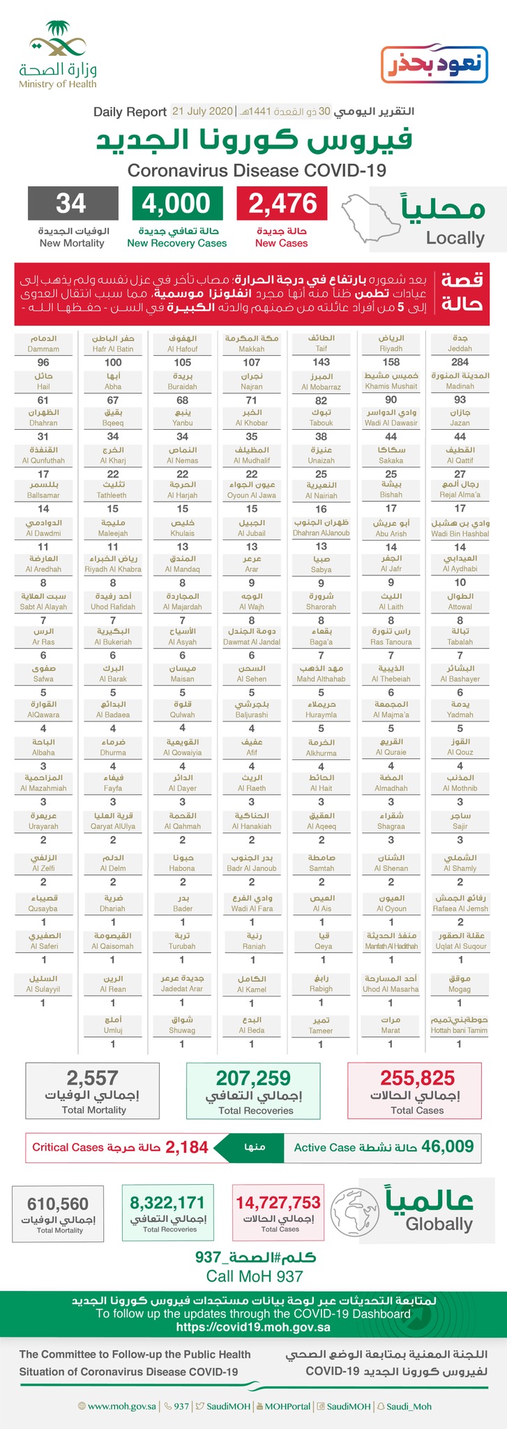 وأعلنت الوزارة تسجيل 34 حالة وفاة جديدة منها حالتي وفاة في القطيف، ليصل عدد الوفيات الكلي إلى 2557 حالة وفاة.
