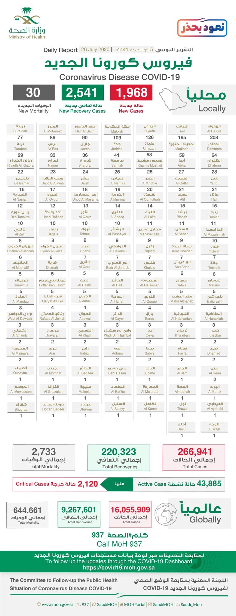 ولمعرفة تفاصيل إجمالي توزيع حالات الإصابة والتعافي، يمكن زيارة الموقع الإلكتروني المخصص من وزارة الصحة للاطلاع على مستجدات الفايروس في المملكة، والإحصاءات اليومية عبر الرابط https: //covid19. moh. gov. sa.