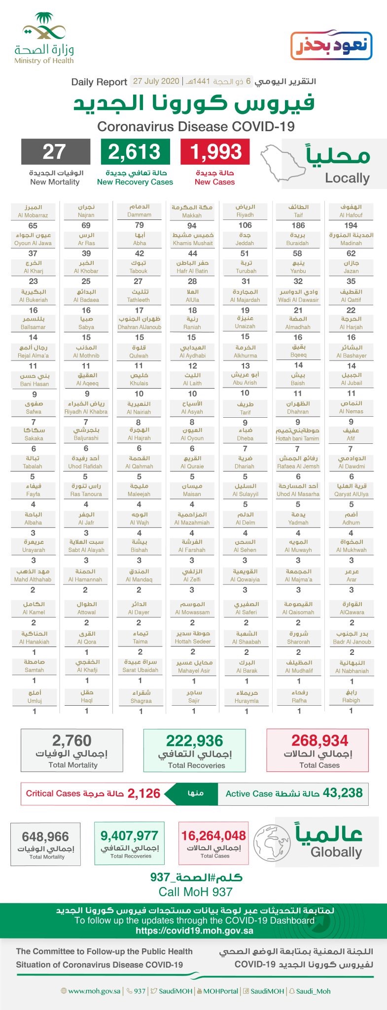 ولفتت الى أنه تم إجراء «53793» فحص مخبري جديد ليصل إجمالي عدد الفحوصات «3110749» فحص، حيث يوضح الجدول المرفق توزيع الحالات الجديدة في مدن المملكة، وكذلك أعداد الإصابة والتعافي والوفيات عالمياً.