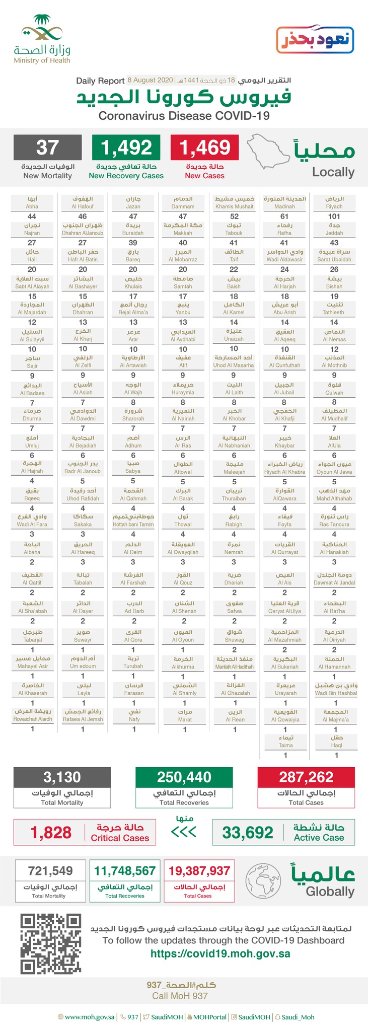 أعلنت وزارة الصحة اليوم ”السبت“ تسجيل 1469 إصابة جديدة بفايروس كورونا المستجد المسبب لمرض ”كوفيد19“. منها 2 في القطيف و2 بصفوى