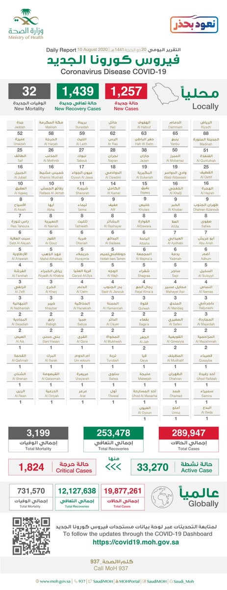 وتم تسجيل 1439 حالة تعافٍ جديدة منها 11 في القطيف 3 بصفوى، لترتفع الحالات الإجمالية للتعافي إلى 253478 حالة ”87% من إجمالي الإصابات المسجلة“.