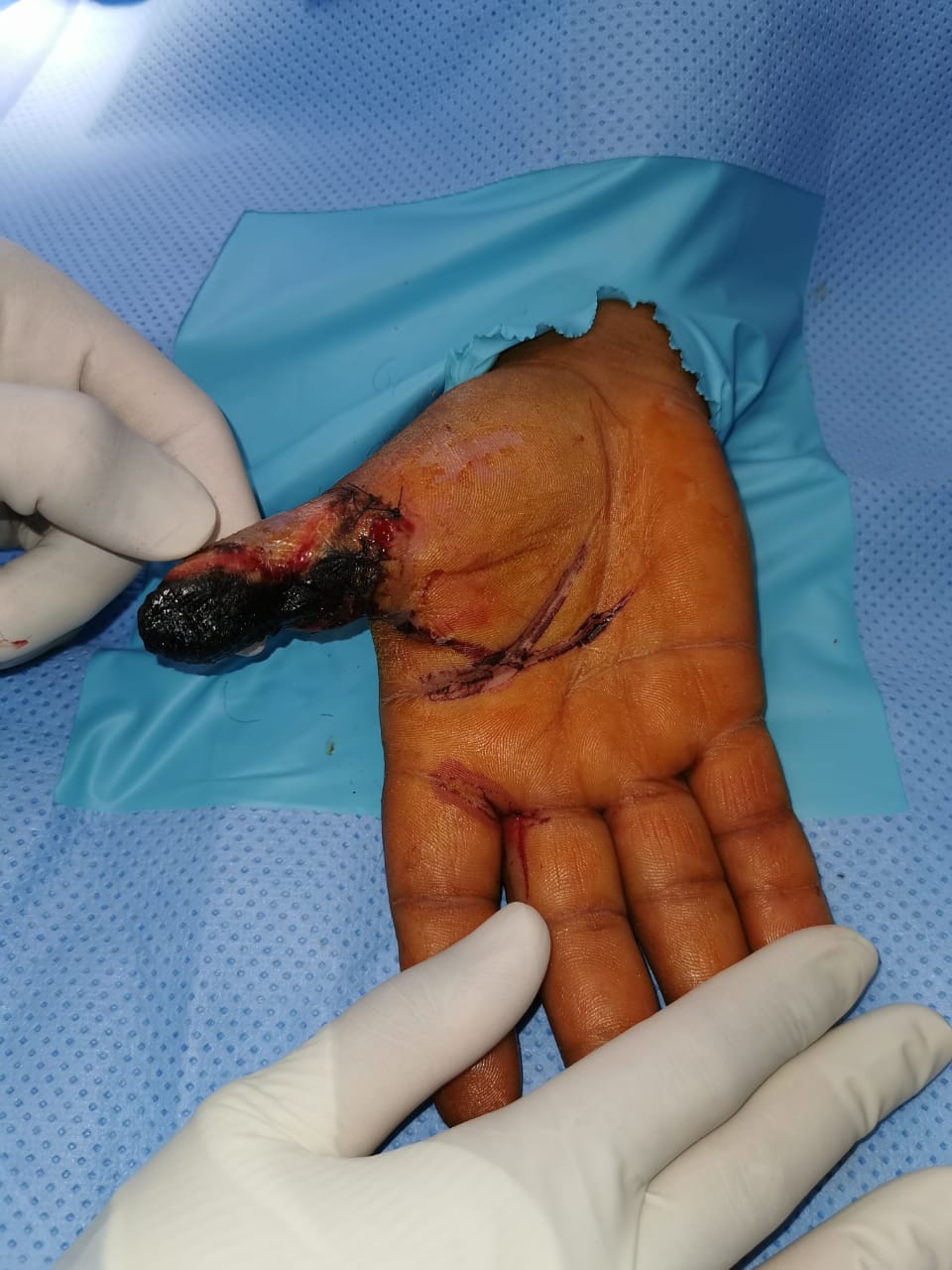 وتمثلت إصابة المريض علي الجاسم المريض بوجود كسور مضاعفة في الإبهام الأيمن مع قطع في الشرايين والأعصاب والأوردة والأربطة.