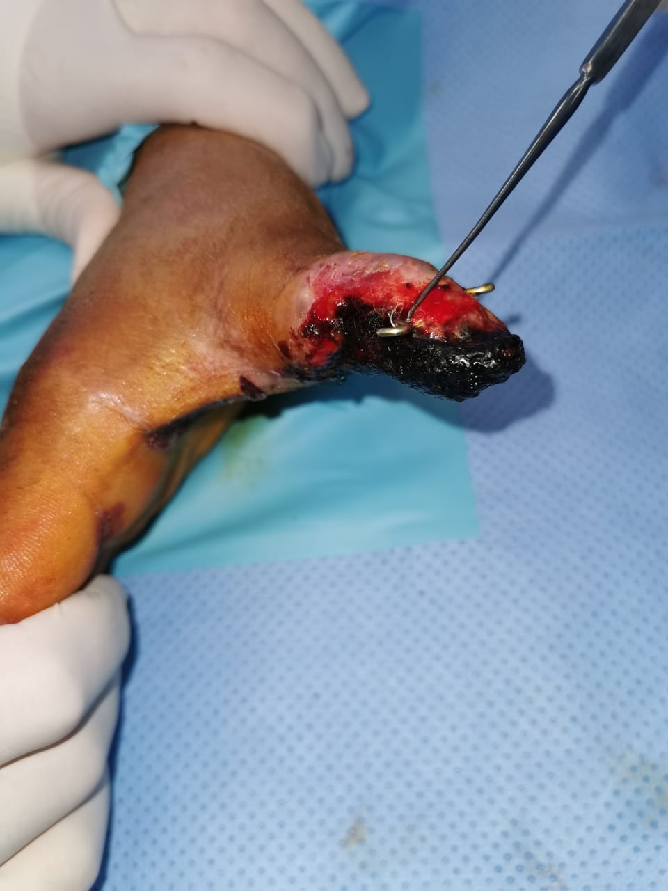 ونوه إلى أنه بالنسبة لحالة المريض وبسبب الغرغرينا والالتهاب الشديد وتسوس العظم وتلف الشريان الرئيسي والتأخير في العلاج لاتزيد نسبة النجاح عن 45٪ عادة في مثل هذه الحالات.