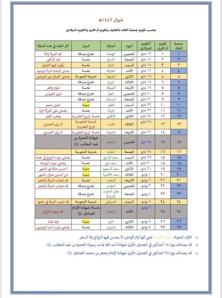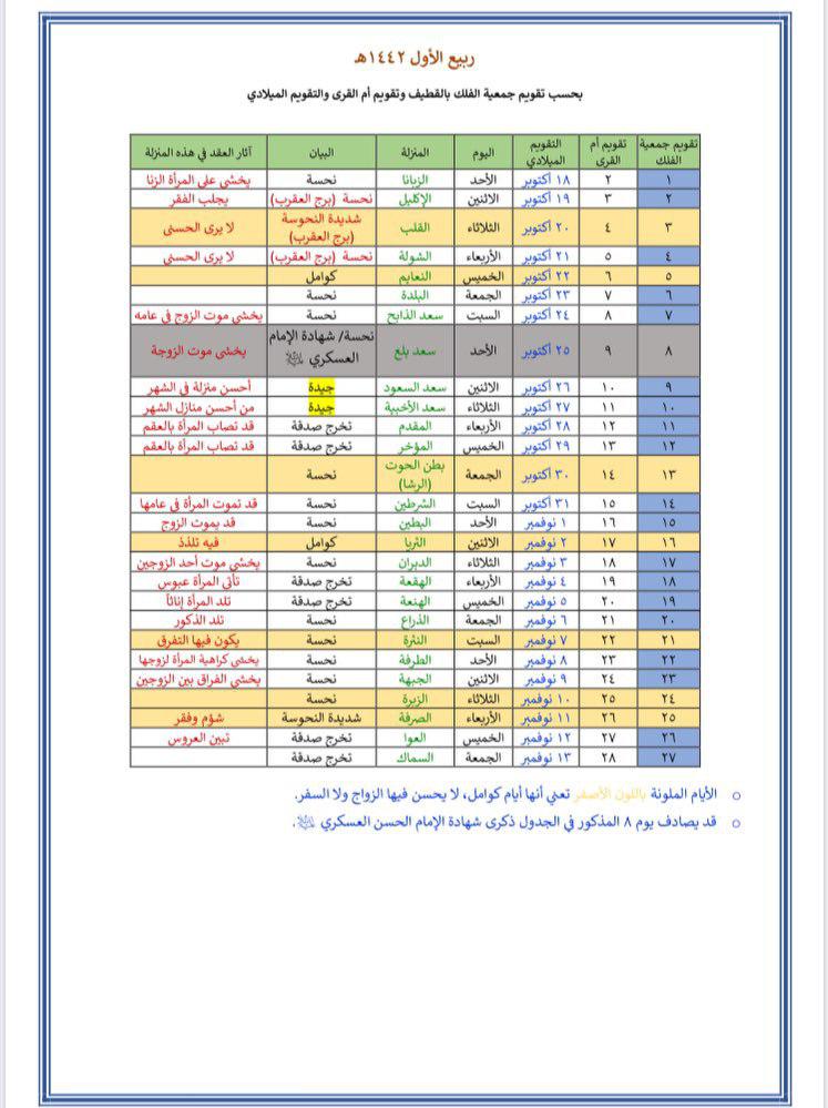 وأصدر مكتب الشيخ آل محسن جدولا يبين الأيام الجيدة والنحسة لعقد الزواج خلال العام القادم 1442 للهجرة، وتم وفقا للحساب الفلكي وليس الثبوت الشرعي، لأن الأثار التي تترتب على العقد هي آثار تكوينية وتتعلق بوضع القمر في المنازل المذكورة.