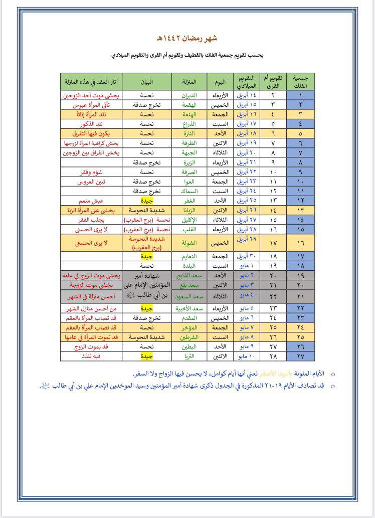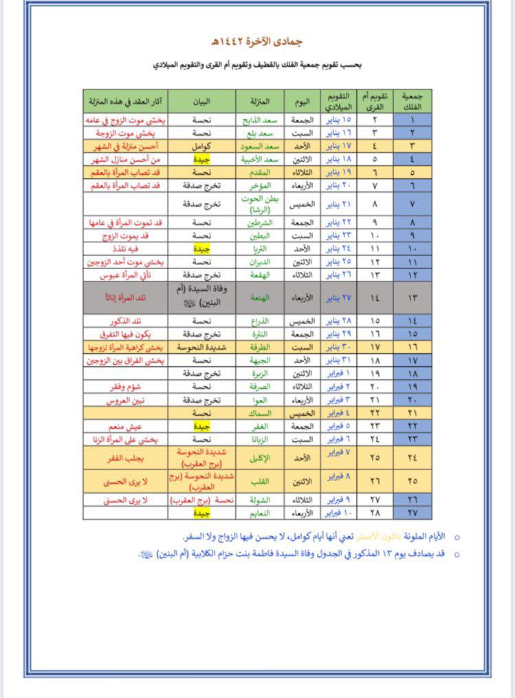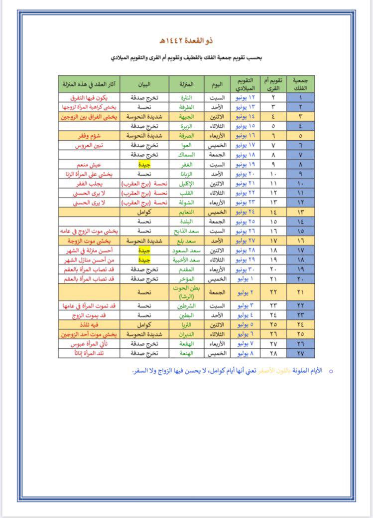 ومن المعلوم أن كل شهر فيه سبعة أيام نحسة، وتسمى ”الكوامل“ وهي «3,5,13,16,21,24,25» من الشهر العربي.