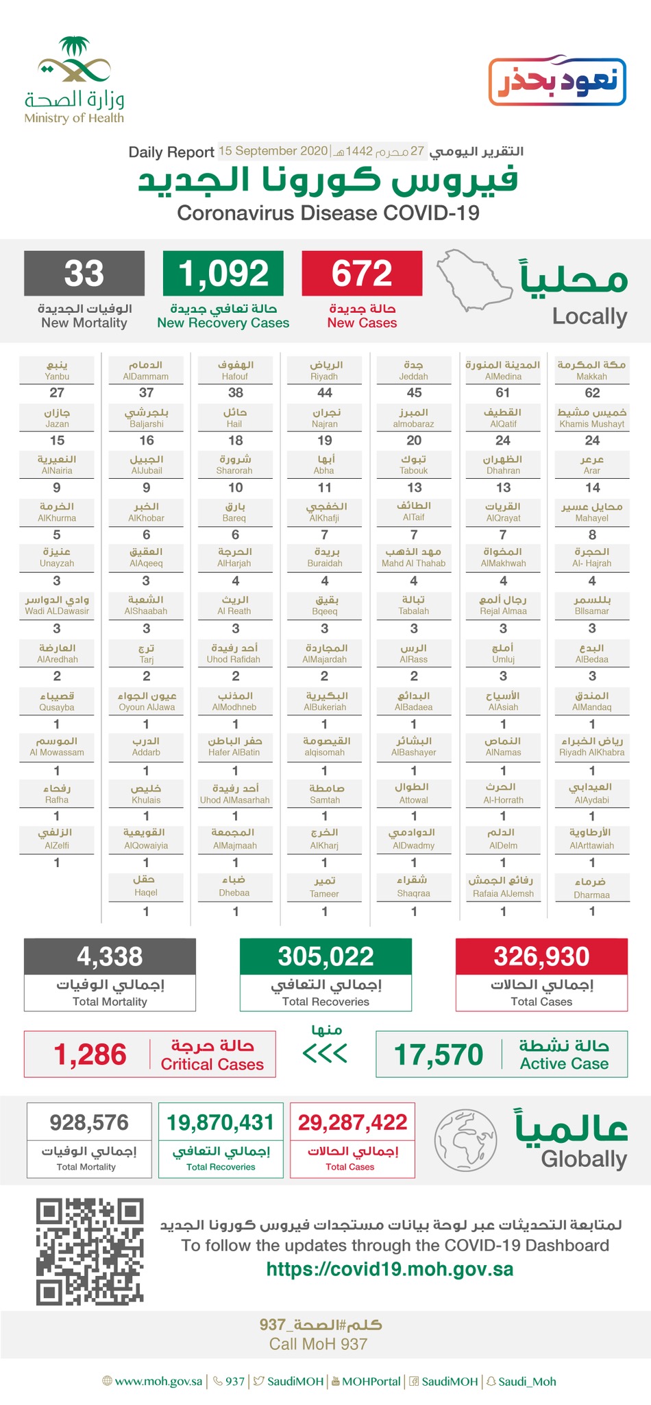 وأشارت الى انه تم تسجيل 1,092 حالة تعافٍ إضافية منها 36 حالة في القطيف وحالة بصفوى ليرتفع إجمالي حالات التعافي 305,022 حالة. (93% من إجمالي الإصابات المسجلة).