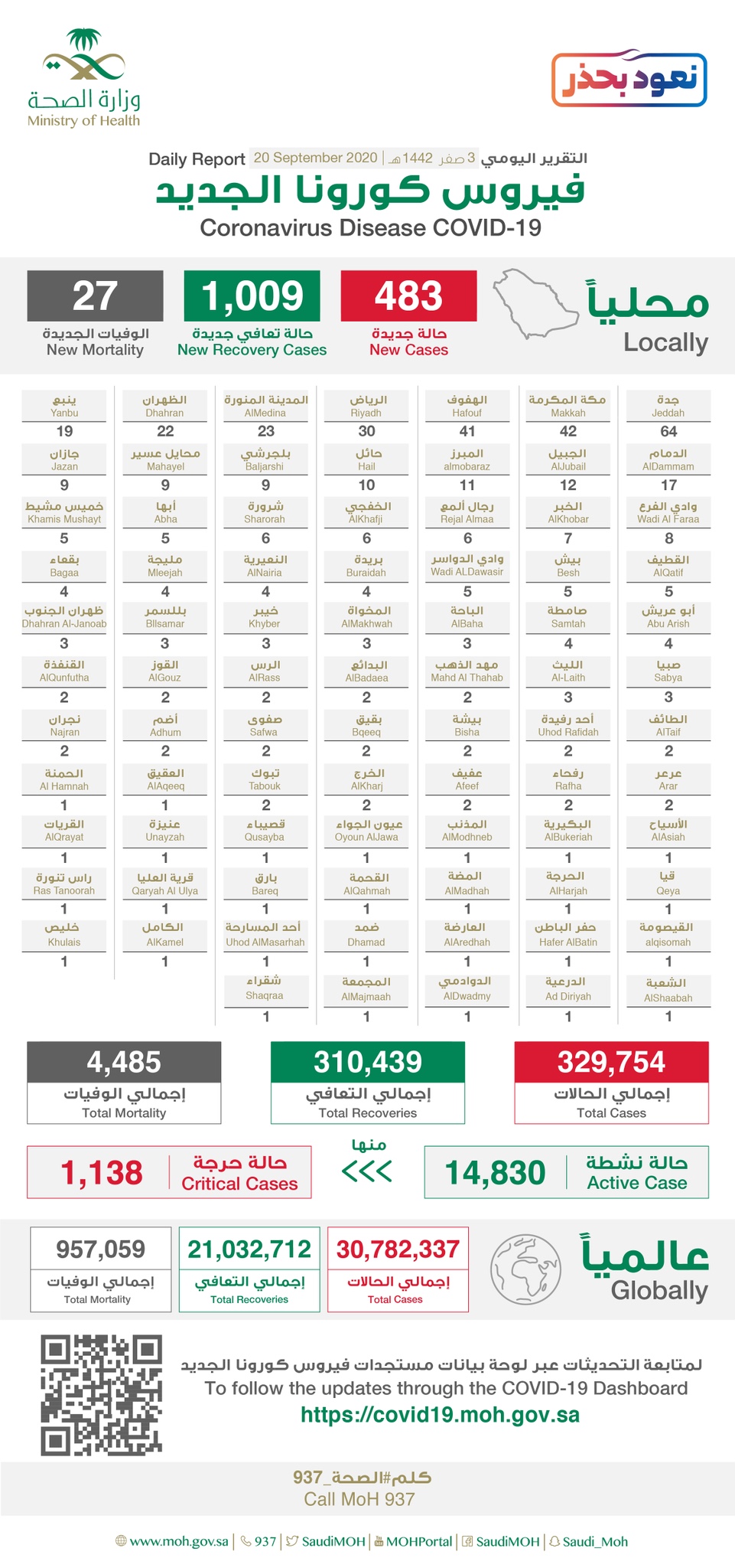 وتم تسجيل 1009حالات تعافٍ جديدة منها 20 في القطيف و10 بصفوى وحالة واحدة بسيهات، لترتفع الحالات الإجمالية للتعافي إلى 310439 حالة. (94% من إجمالي الإصابات المسجلة).