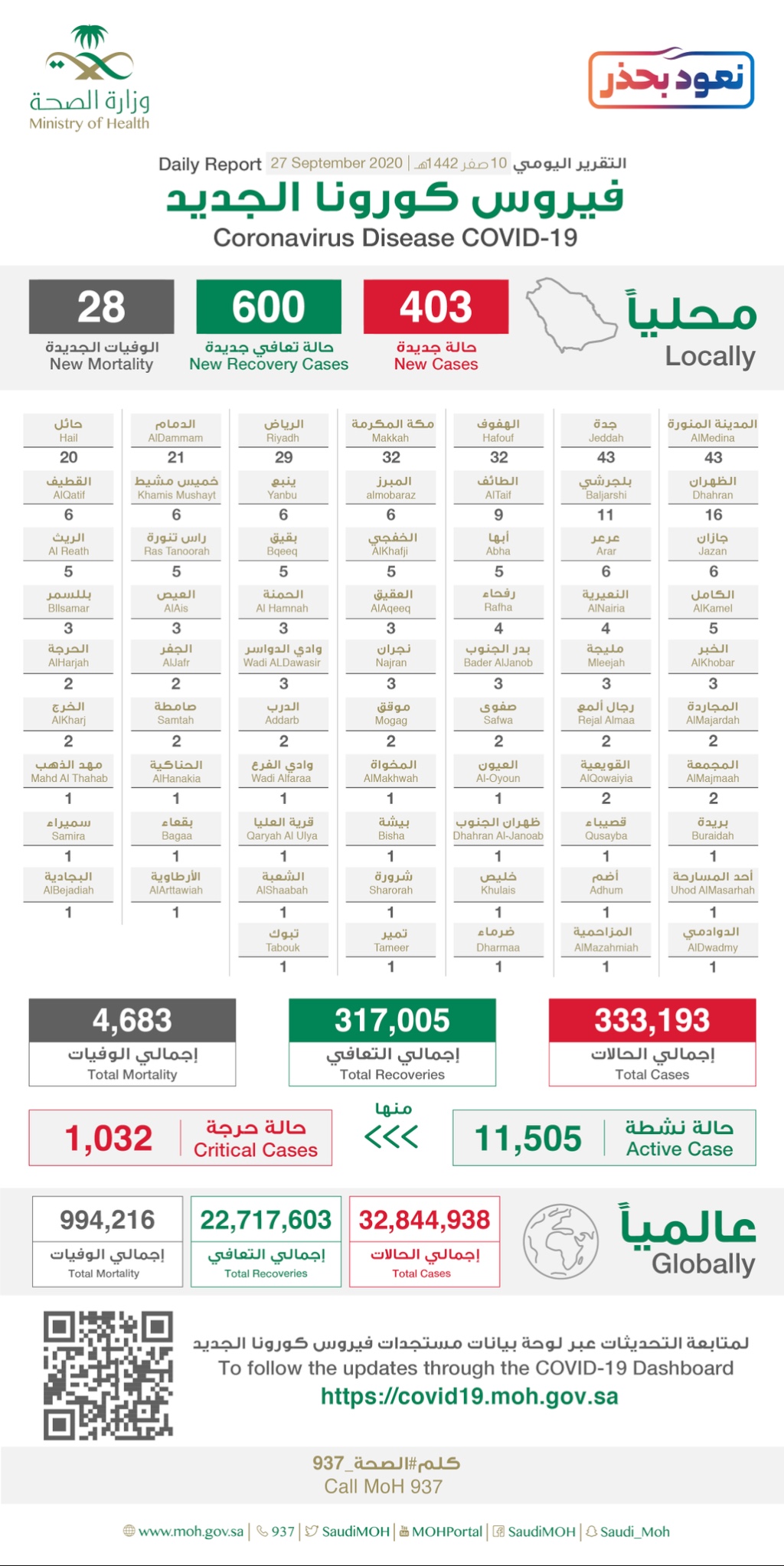 أعلنت وزارة الصحة اليوم ”الاحد“ تسجيل 403 إصابة جديدة بفايروس كورونا المستجد المسبب لمرض ”كوفيد19“. منها 6 في القطيف و”2“ بصفوى. ليرتفع إجمالي الإصابات في المملكة إلى 333193 حالة مؤكدة.