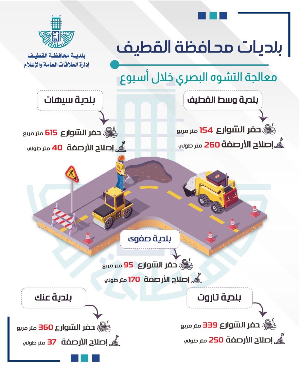 وأصلحت بلدية محافظة القطيف، 757 مترًا طوليًا من الأرصفة، و1563 مترًا مربعًا من حفر الشوارع، بالأسفلت.